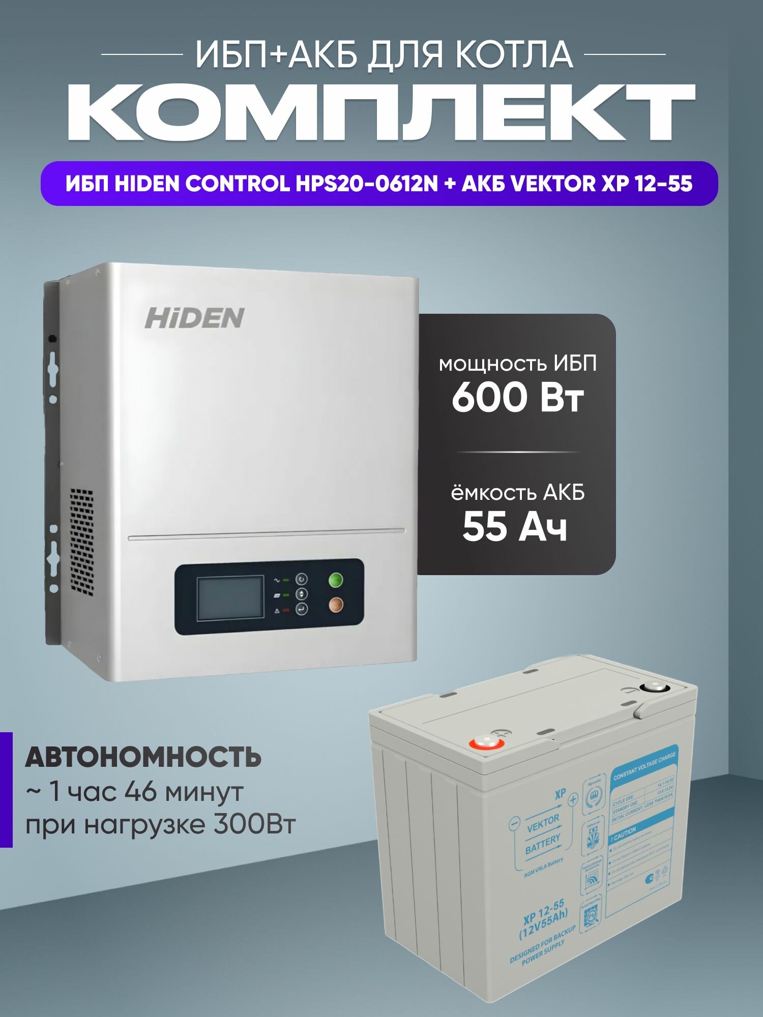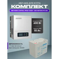 Купить ИБП для котла с аккумулятором ИБП Hiden Control HPS20 600Вт, 12В + АКБ Vektor Energy XP 55Ач, 12В / бесперебойник для котла отопления / источник бесперебойного питания с доставкой по всей России.
