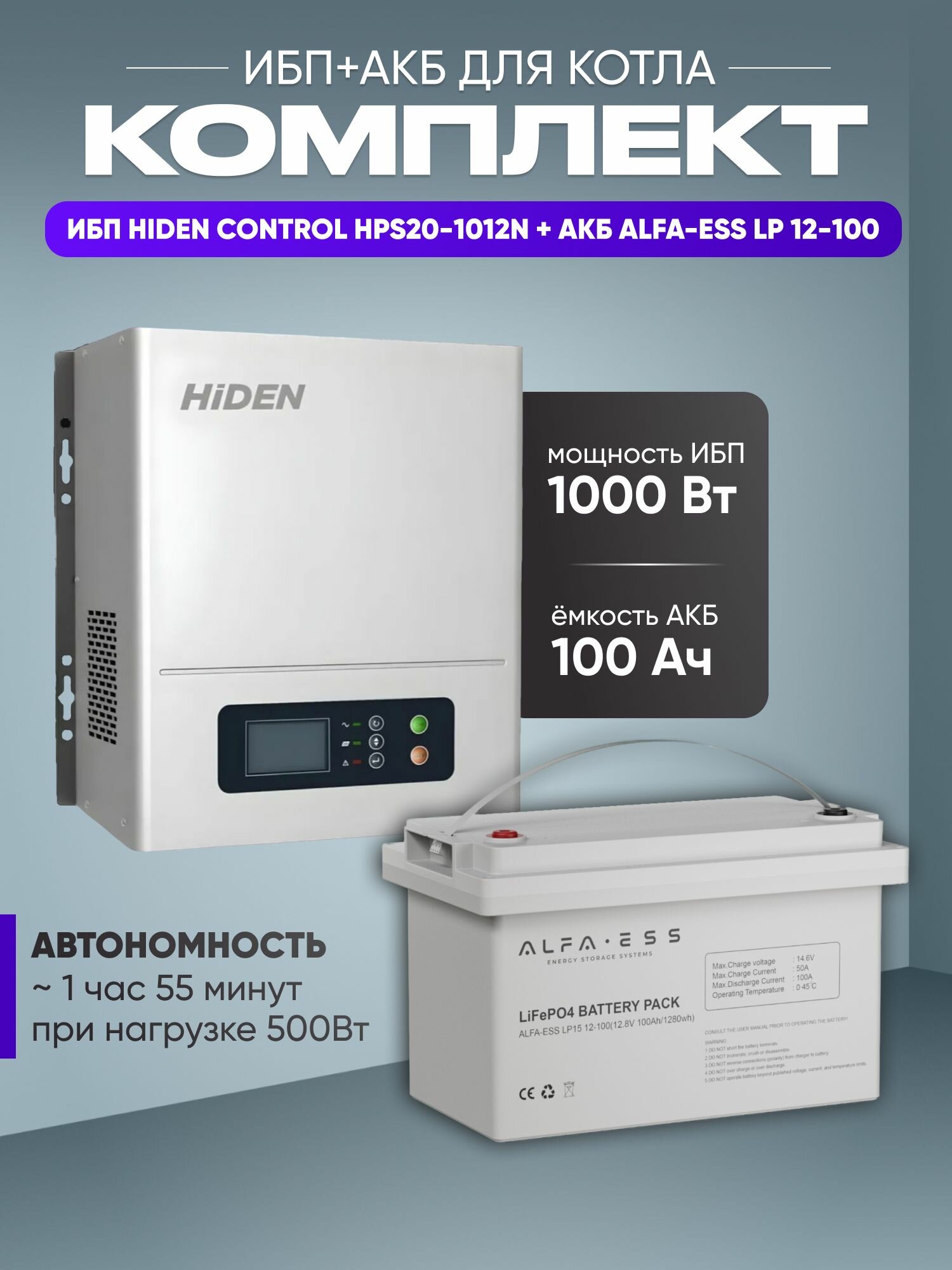 Купить ИБП для котла с аккумулятором ИБП Hiden Control HPS20N 1000Вт, 12В + АКБ ALFA LP15 100Ач, 12В / бесперебойник для котла отопления / источник бесперебойного питания с доставкой по всей России.