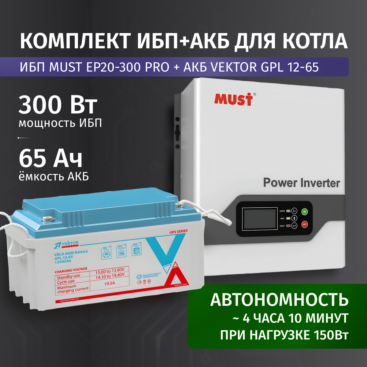 ИБП для котла с аккумулятором ИБП MUST EP20 PRO 300Вт, 12В + АКБ Vektor Energy GPL 65Ач, 12В / бесперебойник для котла отопления / источник бесперебойного питания: сравнение цен, характеристики, фото, актуальное наличие и цены.