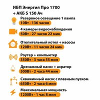 Купить ИБП Энергия Про 1700 + Аккумулятор S 150 Ач — 12В (1200Вт — 68мин) с доставкой по всей России. ИБП Энергия Про 1700 + Аккумулятор S 150 Ач — 12В (1200Вт — 68мин): сравнение цен, характеристики, фото, актуальное наличие и цены.