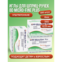 Инсулиновые иглы BD Micro-Fine Plus для шприц-ручек 4 мм 32G 300 штук — медицинские принадлежности для комфортных инъекций людям с сахарным диабетом. Ультратонкие одноразовые иголочки подходят для введения лекарств: Semavic (Семавик), Ozempic (Оземпик), Семуглин Некст, Саксенда, НовоРапид, Туджео СолоСтар, Апидра, Левемир, Тресиба, Фиасп, Актрапид, Протафан, Лантус (Лаутус), РинсулИн, РосИнсулин, Квинсента и других препаратов для контроля уровня сахара в крови.
