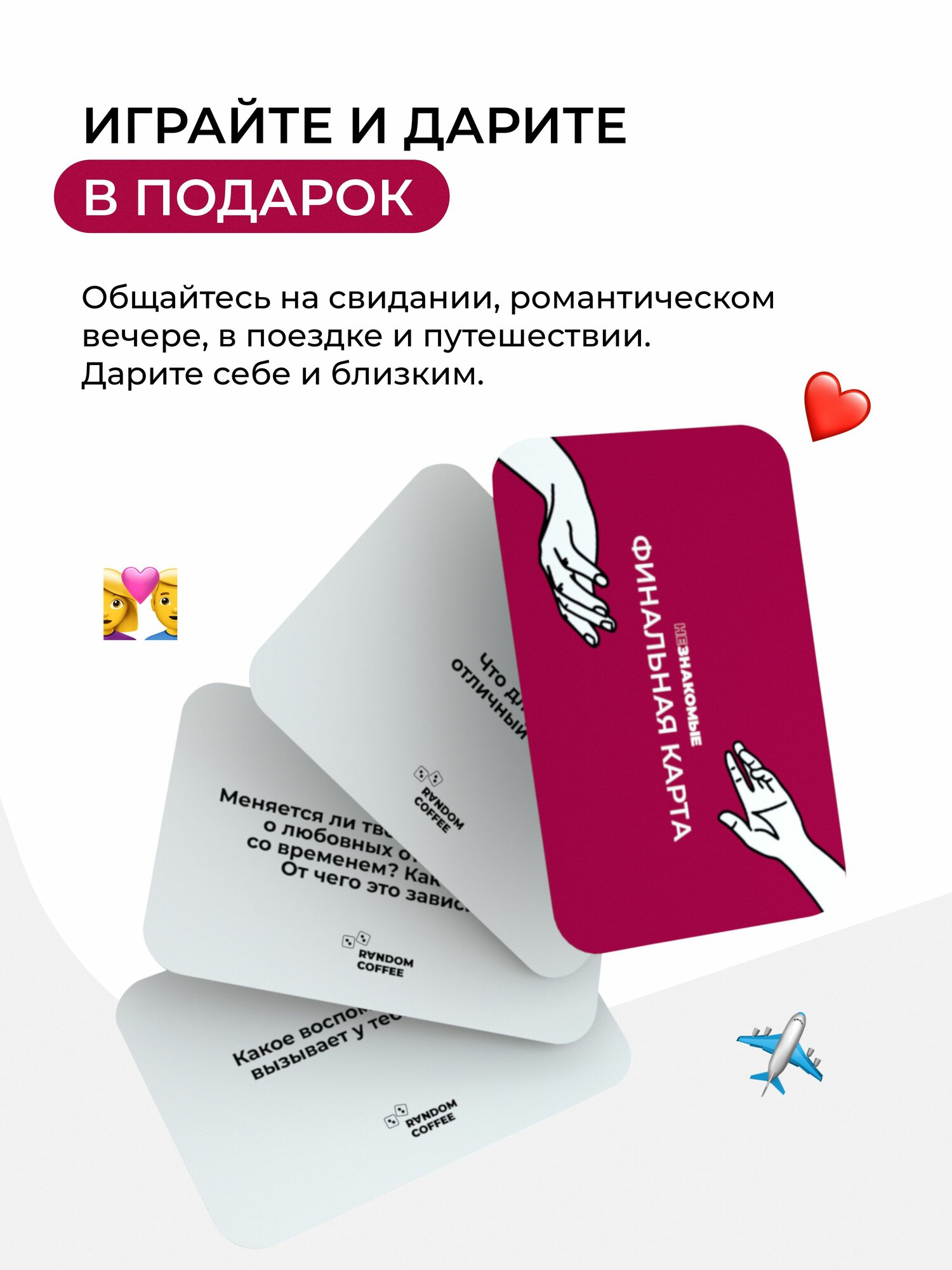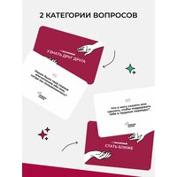 Трудно представить себе более удачный подарок любимому / любимой, мужу / жене на ближайшие праздники, связывающие партнеров и супругов: 14 февраля, 23 февраля и 8 марта. Близкие люди станут еще ближе друг к другу в доброжелательных и искренних диалогах, которые подарит игра.
