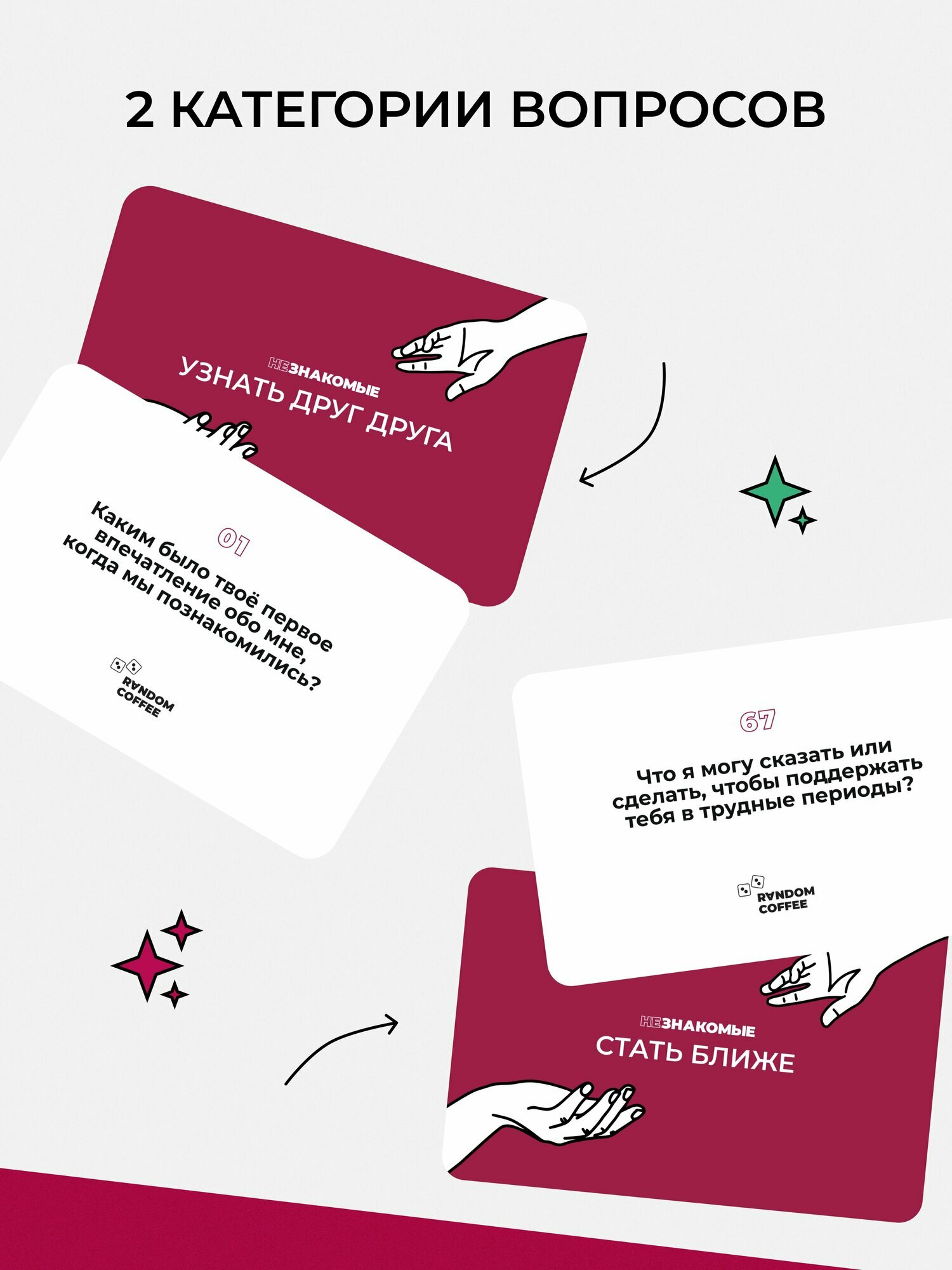 Разговор состоит из вопросов и ответов. Нет вопросов – нет и ответов. Как итог, разговор не клеится. И в этом корень проблемы: задавать правильные вопросы бывает совсем не просто. То момент неподходящий, то нужные слова не находятся. А порой банально боишься, что тебя не поймут и не захотят продолжать общаться. Серия коммуникационных игр «Незнакомые» помогает устранить эти сложности: сломать лед в общении, найти темы для глубоких содержательных бесед и стать ближе с собеседниками. Выберите игру, исходя из своих предпочтений и задач.