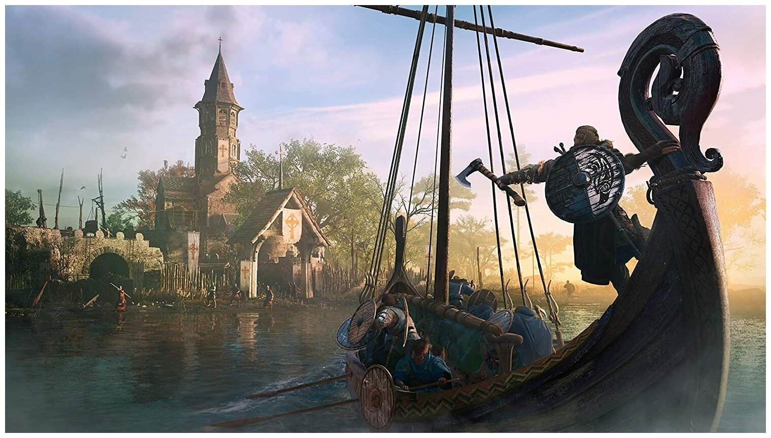 IX век нашей эры. Из-за непрерывных войн и скудеющих ресурсов выживать в землях Норвегии становится все труднее. Викинг Эйвор ведет свой клан через Северное море к богатым берегам враждующих королевств Англии. Перед викингами стоит задача – любой ценой обосноваться на новой земле, которая станет их домом. Нового героя Assassin’s Creed взрастили на легендах о битвах и воинской славе. Вам предстоит сыграть за яростного викинга по имени Эйвор. Исследуйте живописный и таинственный открытый мир в суровом антураже Англии в темные века. Уничтожайте врагов, развивайте селение и усиливайте влияние, чтобы заслужить место среди богов в Вальгалле. Гремят войны. Распадаются королевства. Это эпоха викингов. Напишите свою сагу о викингах – улучшенная механика RPG позволит вам влиять на развитие персонажа и окружающий мир. Каждый сделанный выбор – выбор союзника, тактики в бою, варианта ответа в диалоге или элемента снаряжения – сформирует ваш собственный путь к славе. Боевая система – сражайтесь, держа в обеих руках по топору или мечу, или используйте оружие в комбинации со щитом. Освойте беспощадную боевую систему викингов. Рубите головы бескомпромиссным ударом, устраняйте противников издалека или задействуйте скрытный клинок, незаметно приблизившись к цели. Испытайте себя в битвах против самого богатого набора беспощадных противников в истории Assassin’s Creed. Открытый мир в темные века – совершите путешествие от таинственных и суровых берегов Норвегии к прекрасным, но недоступным королевствам Англии и не только. Прочувствуйте образ жизни викингов, занимаясь рыбной ловлей и охотой или проводя время за играми и выпивкой. Устраивайте набеги – сражайтесь с саксами и штурмуйте их крепости на всей территории Англии. Устраивайте стремительные нападения на драккарах и разоряйте вражеские территории, чтобы обеспечить своих людей ресурсами. Развивайте селение – стройте и улучшайте здания – казармы, кузницу, мастерскую татуировщика и многое другое – создавая проработанную систему. Нанимайте новых людей в клан и персонализируйте игровой процесс за викинга. Викинги-наемники – создайте уникального викинга-воина с изменяемым внешним видом в вашем клане и поделитесь персонажем с друзьями в сети – они смогут использовать его во время набегов.