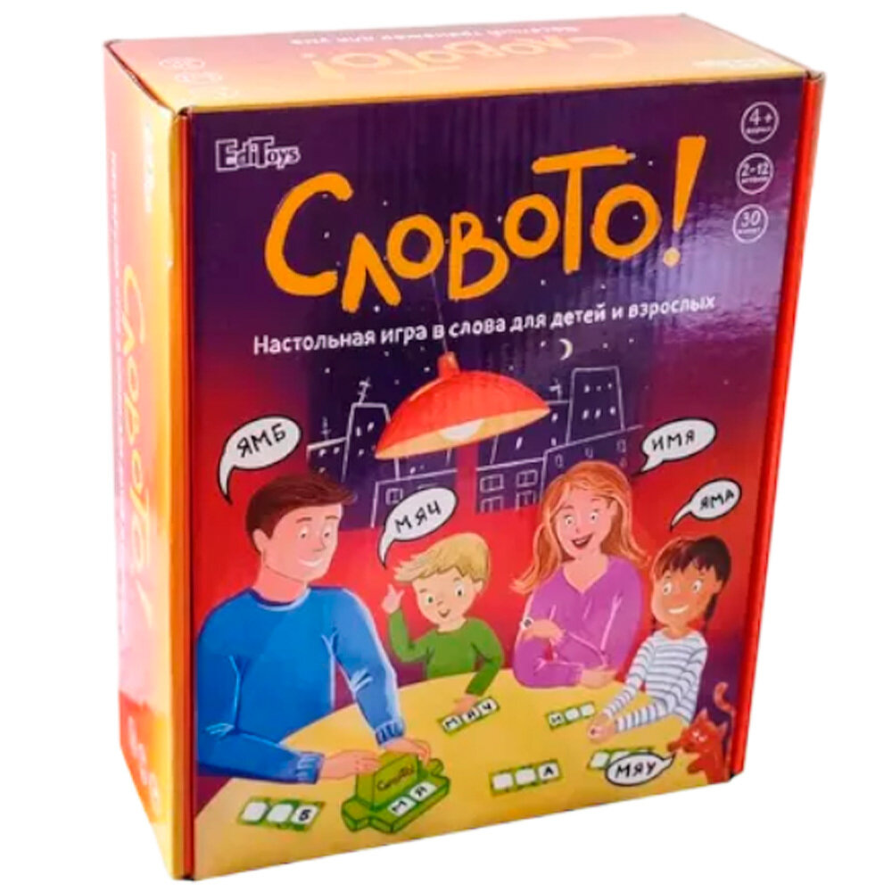Игра СловоТо! для детей и взрослых DT1203/1204. Размер упаковки: 27*22*9 см Вес: 820 г Функционал: настольная игра Упаковка: картонная коробка Страна обладатель бренда: Россия Материал: картон, пластик Комплектация: карточка - 36 шт, фишка - 72 шт. Возраст ребенка: от 4 лет Настольная игра позволит весело и интересно провести совместный досуг с друзьями и в кругу семьи. Красочные элементы привлекут внимание ребенка. Суть игры: игра сочетает в себе игру в слова типа Скрэббл и лото. Игроки выбирают 3-х буквенные карточки (или берут их по ходу игры), а ведущий заполняет фишками контейнер. Как только ведущий открывает две фишки, сдвигая контейнер вперед-назад, игроки выкрикивают буквы и нажимают звонок, забирая фишку для закрытия клетки с буквой на своей карточке. Побеждает тот, кто соберет больше всего слов и наберет большее количество балов. Оригинальная игра поможет с пользой провести время. Настольная игра направлена на развитие логического мышления, коммуникативных навыков, умения манипулировать мелкими предметами. Все элементы игры выполнены из качественных и прочных материалов, окрашенных безопасными нетоксичными красками, устойчивых к износу и выгоранию. Более подробные правила в инструкции. Количество игроков: 2-12. Продолжительность игры - 20 минут.