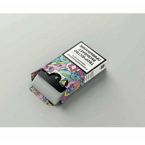 Уникальная иллюстрированная игральная колода, созданная коллективным трудом десятков иллюстраторов и дизайнеров. Ее особенность — 77 карт с авторскими иллюстрациями известных авторов со всей России, а также фирменная фишка — новая пятая масть «Лайки», отдельная карта «11 пик», а также множество джокеров. Каждая карта оформлена профессиональным дизайнером или иллюстратором в своей уникальной графической манере. Рубашка колоды создана дизайнером и нейросетью Николаем Ироновым.