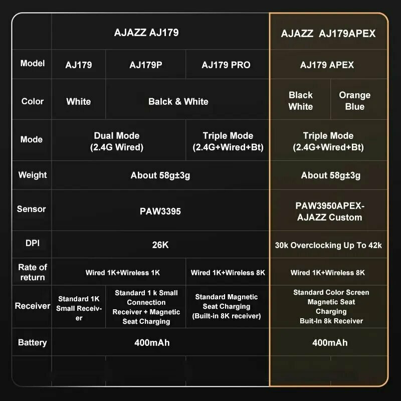 AJ179 / AJ159 APEX is equipped with a 400mAh battery, which incorporates AJAZZ's advanced low-power technology, significantly extending battery life and supporting long-term gaming without the need for frequent charging.
