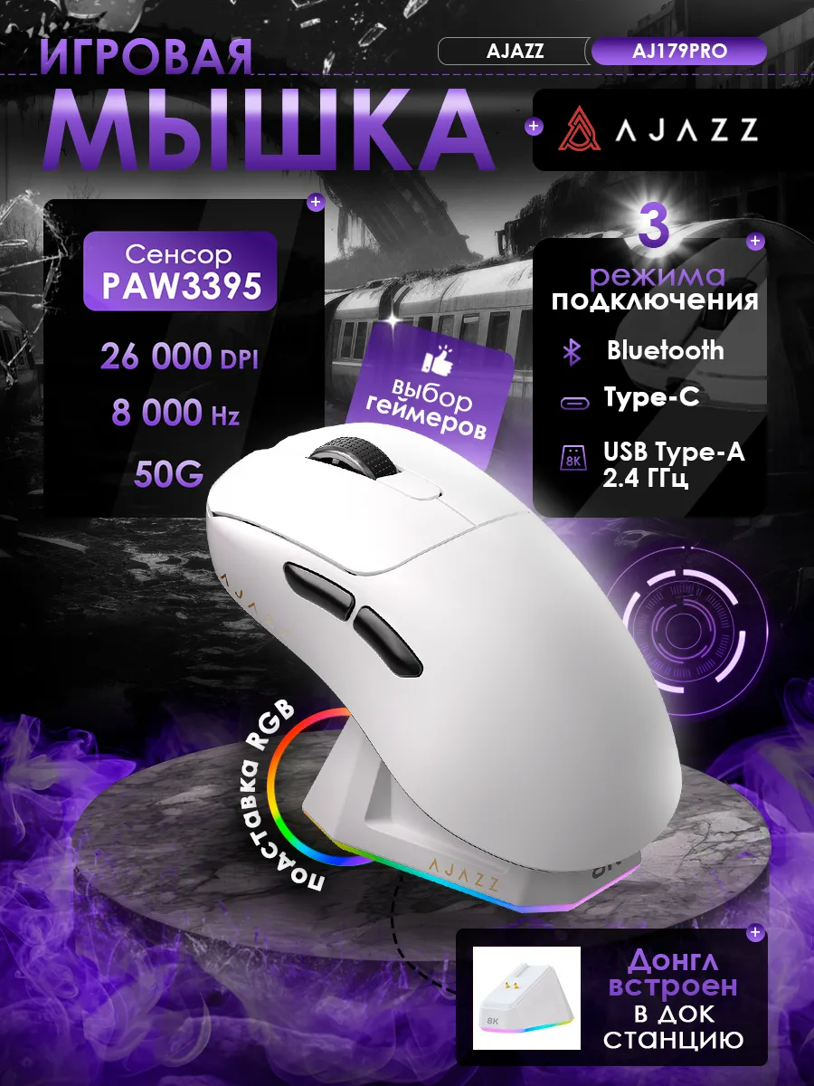 Игровая беспроводная / проводная мышь AJAZZ AJ179 PRO, PAW3395, 8000 Гц с док-станцией: сравнение цен, характеристики, фото, актуальное наличие и цены.