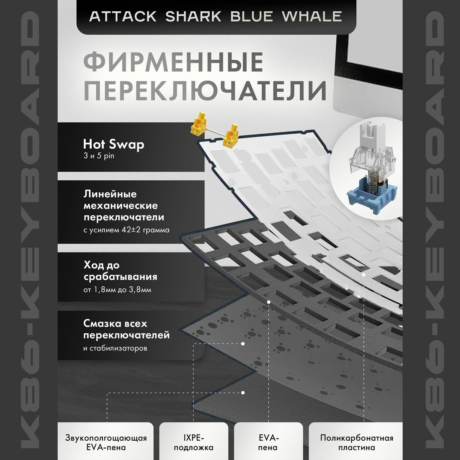| Комплектация | механическая клавиатура Attack Shark K86 RGB, USB-кабель, руководство пользователя, свитч-пуллер, кейкап-пуллер, 2 запасных свитча |