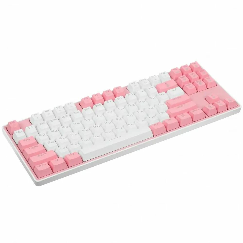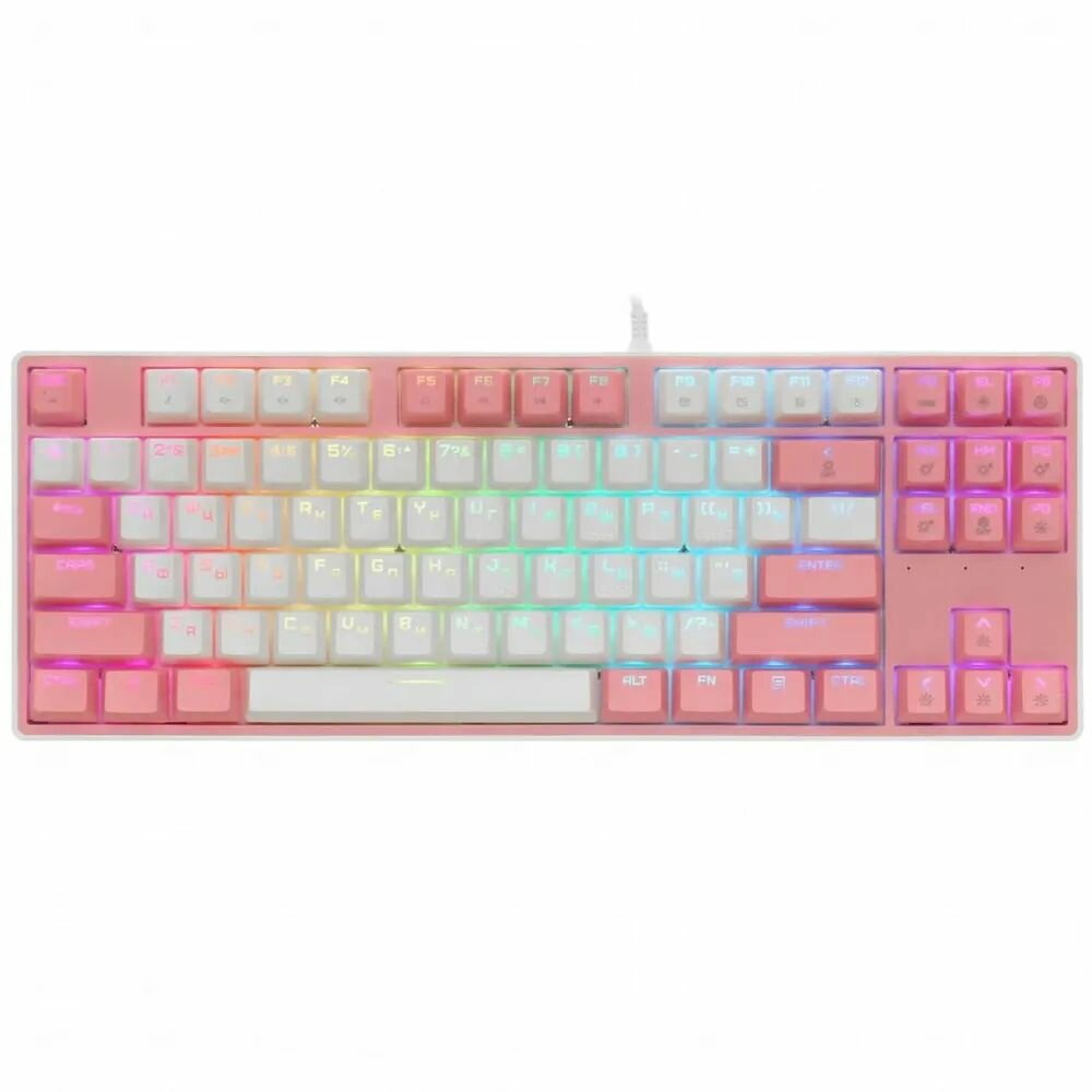 Бело-розовая клавиатура проводная ARDOR GAMING Pathfinder механического типа нравится геймерам благодаря плавному ходу 87 кнопок и возможности программирования их работы. В основе их хода – линейные переключатели Kailh LongHua. ANSI-раскладка выполнена на английском и русском языках.RGB-подсветка с 14 режимами работы программируется по желанию пользователя. Подключение ARDOR GAMING Pathfinder к ПК осуществляется за счет кабеля длиной 1.8 м. Корпус модели выполнен из пластика. Ресурс нажатий составляет 50 млн для каждой кнопки.
