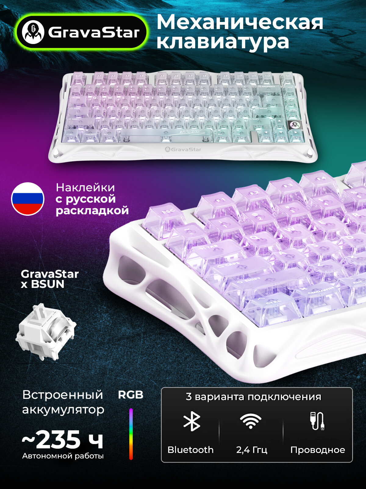 Купить Игровая клавиатура Gravastar Mercury K1 Lite XTAL AURORA, 3 вида подключения: Bluetooth, 2,4 ГГц, USB, RGB подсветка с доставкой по всей России. Игровая клавиатура Gravastar Mercury K1 Lite XTAL AURORA, 3 вида подключения: Bluetooth, 2,4 ГГц, USB, RGB подсветка: сравнение цен, характеристики, фото, актуальное наличие и цены.