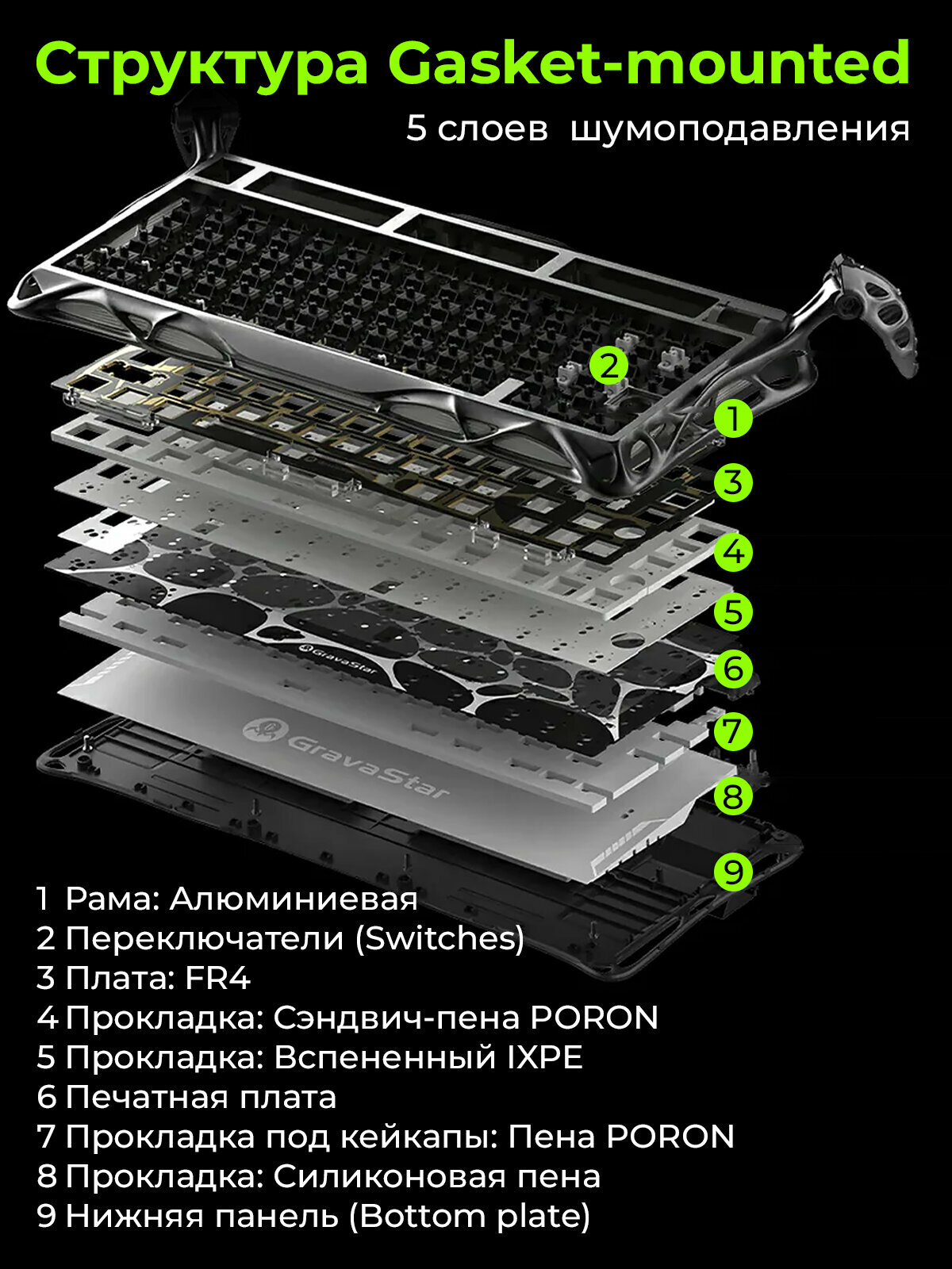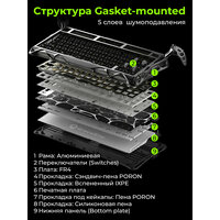 | Комплектация | Механическая клавиатура GravaStar GS K1 75*1 Опытный вал (по 1 желтому, фиолетовому, синему и белому)*4 Съемник клавиш*1 Кабель TYPE-C/USB*1 Инструкция по эксплуатации*1 |