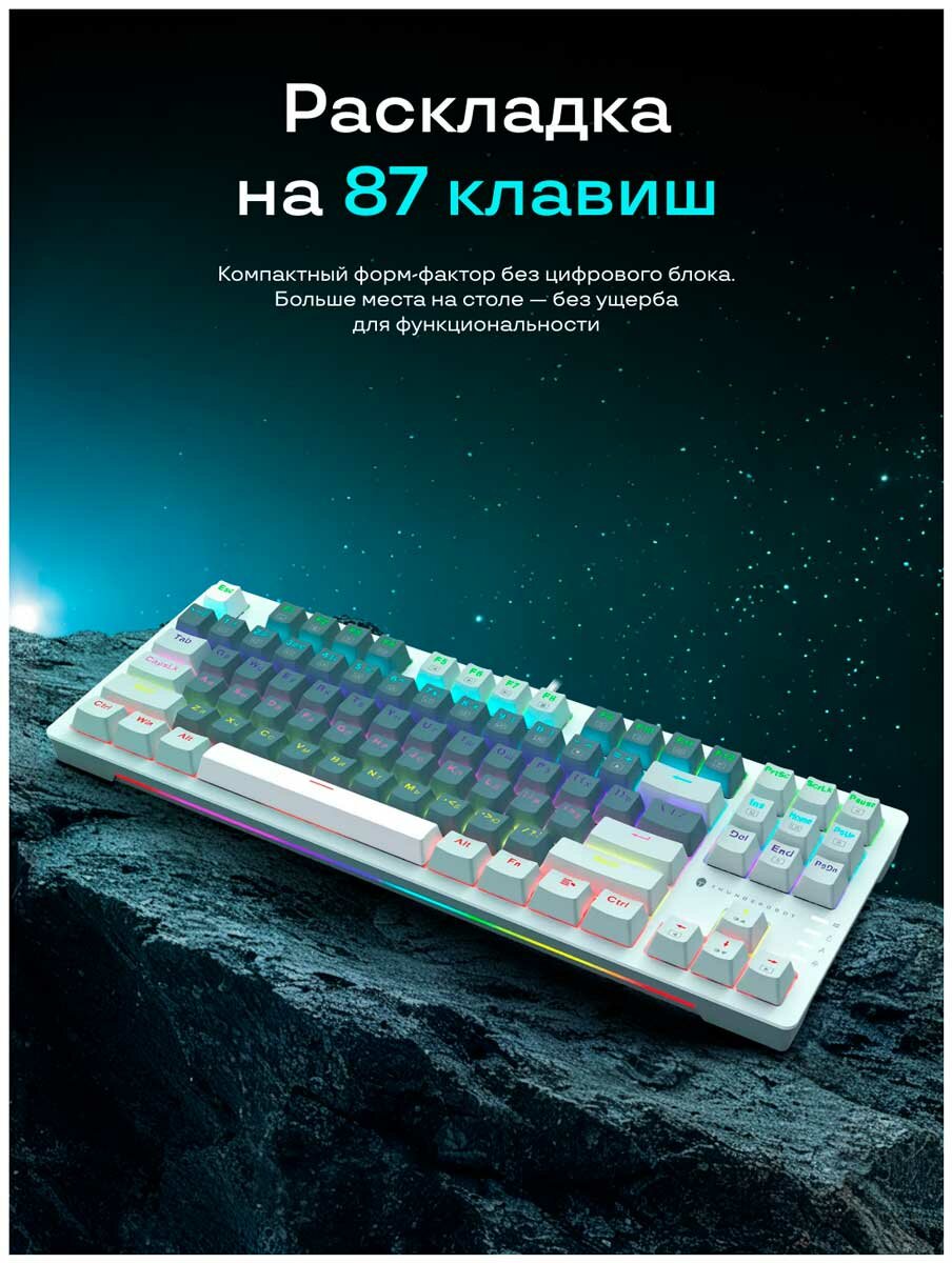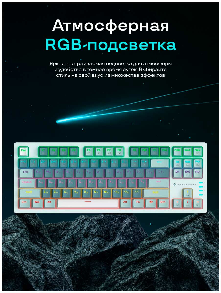 Игровая клавиатура Thunderobot K87R Sage Green (JT00FH000RU) - модель механического типа, которая обладает стандартной раскладкой - англоязычной и русскоязычной, что упрощает набор текста. Конструкция выполнена из прочного, надежного пластика. Устройство обладает 87 клавишами.