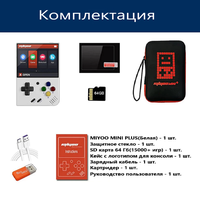 | Подробная комплектация | Игровая консоль Miyoo Mini Plus - 1 шт.; SD-карта с играми - 1 шт.; Защитное стекло - 1 шт.; Картридер - 1 шт.; Зарядный кабель - 1 шт.; Кейс с логотипом для консоли - 1 шт. |