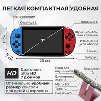 Портативная игровая консоль X12 Plus имеет большой 7-дюймовый экран высокой четкости, который обеспечивает отличное качество изображения и бережно относится к глазам. Помимо встроенной памяти на 16 ГБ в консоли есть слот для дополнительной карты памяти до 32G. Позволяет просматривать видео, фотографии, слушать музыку, читать книги. На ней уже установлены 1000 игр. Встроенные динамики позволяют качественно воспроизводить звук. С помощью провода портативную консоль можно подключить к телевизору. Дополнительные характеристики игровой консоли X12 Plus: Материал: АБС пластик; Количество встроенных игр: 1000+ Память 16 ГБ + поддержка расширения карты TF; Размер экрана: 7 дюймов; Емкость аккумулятора: 2500 мАч; Заряжается от USB; Формат видео: BMVB, FLV, AVI, MP4, 3GP(поддерживает воспроизведение видео 1080 * 720P); Формат аудио: MP3, WMA WAV и другие; Максимальное расширение памяти: максимальная карта TF 32G (не входит в комплект); Размер: 25 х 11,5 х 2 см; вес: 320 г. Комплектация: Игровая консоль, TV провод, USB провод, наушники,