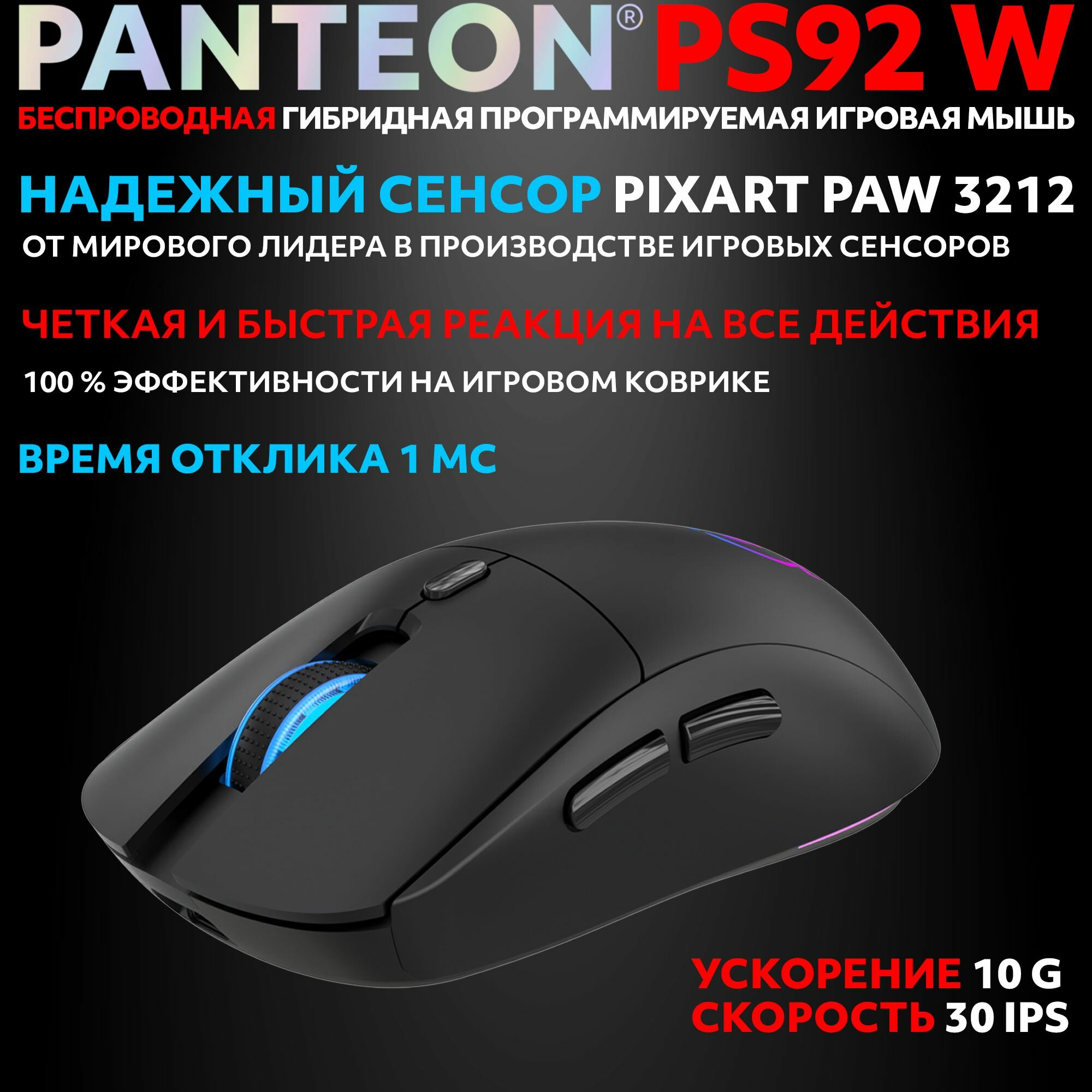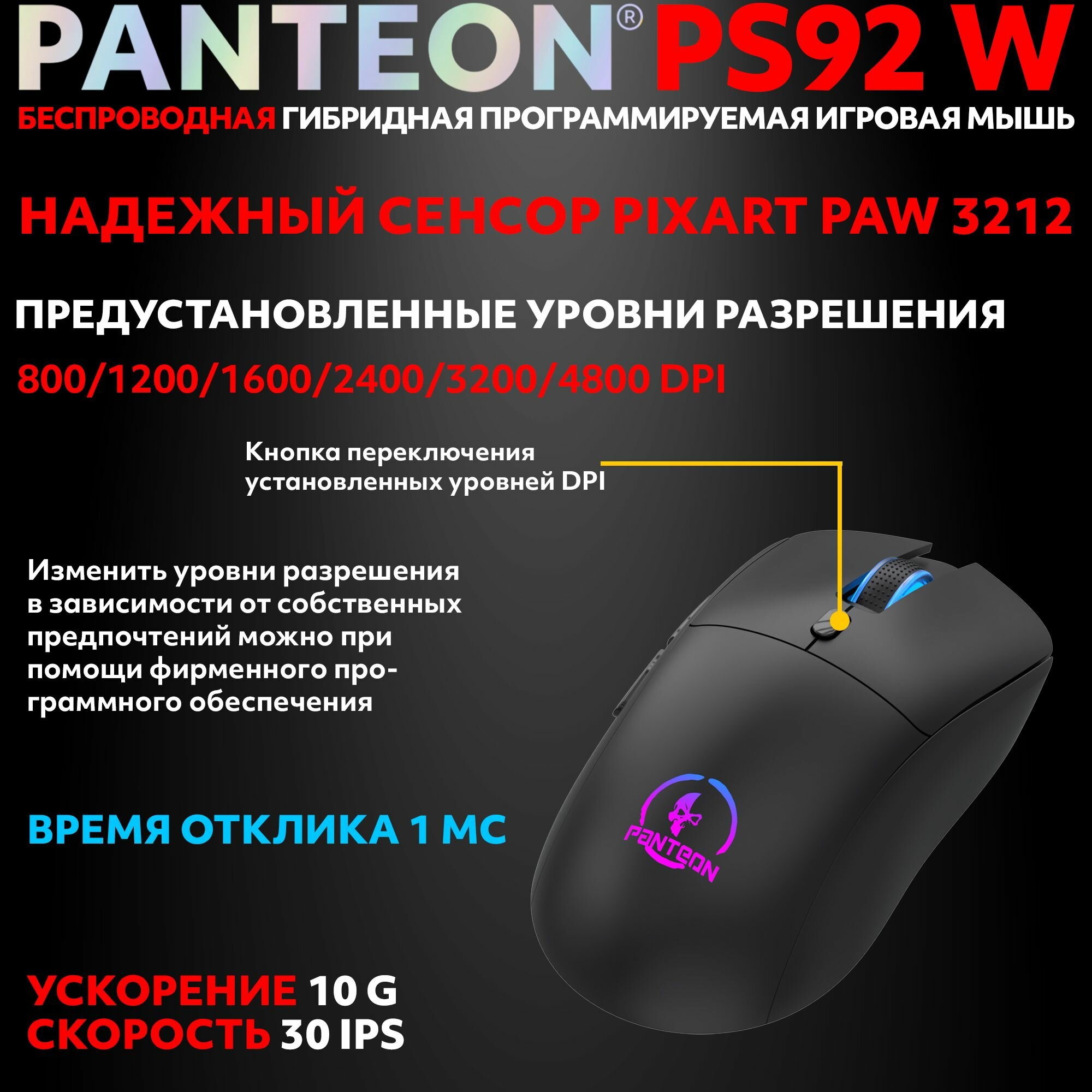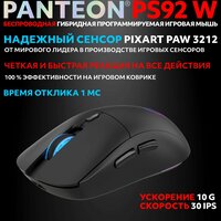 Корпус Модель PANTEON® PS92 W выполнена в стильном симметричном корпусе длиной 12 сантиметров, благодаря чему комфортно ложится под среднюю и большую руку. Ультрамалый вес мыши (60 г) облегчает работу и снижает усталость при длительном использовании. Матовая поверхность дарит приятные тактильные ощущения, обеспечивает надежный хват, обладает высокой устойчивостью к истиранию и легко поддается чистке. Колесо прокрутки не проскальзывает благодаря рифленой поверхности и четкому шагу прокрутки. Сенсор Надежный сенсор PIXART PAW 3212 обеспечивает точность позиционирования курсора, а также четкую реакцию на движение руки пользователя при скорости и ускорении до 30 IPS/10G. Для достижения максимальной эффективности работы сенсора рекомендуется использовать мышь на специальной игровой поверхности (коврике). Установленные по умолчанию уровни разрешения сенсора - 800/1200/1600/2400/3200/4800 DPI, в любой момент пользователь может выбрать один из предустановленных режимов при помощи кнопки DPI, расположенной рядом с колесом прокрутки. Максимальное разрешение сенсора составляет 7200 DPI и доступно при настройке уровней через ПО. Разработчик сенсора (компания PIXART) не рекомендует использовать максимальное разрешение, чтобы избежать «фризов». Программное обеспечение Фирменный софт позволяет производить персональные настройки мыши - менять функционал кнопок, записывать макросы и настраивать подсветку. ПО доступно для скачивания на сайте panteon в разделе «Скачать ПО».