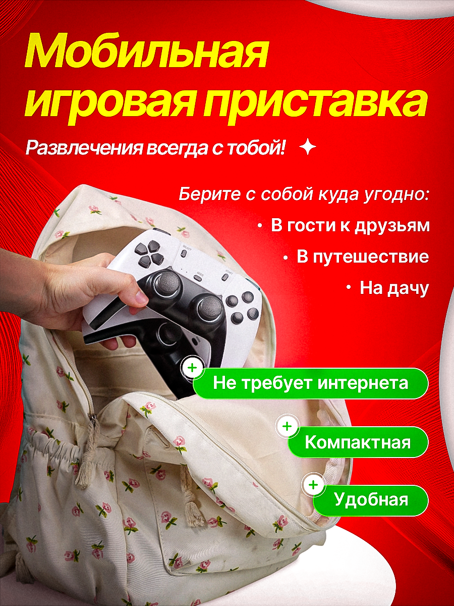 Вы можете наслаждаться любимыми играми практически везде благодаря легкому весу и возможности подключения к любому телевизору и монитору. В комплекте приставки два джойстика, что позволяет играть вдвоем одновременно, устраивая настоящие турниры между друзьями и членами семьи. Она прекрасно подойдет как детям, так и взрослым игрокам, предпочитающим качественный геймплей и возможность отдохнуть после рабочего дня в уютной домашней обстановке. Благодаря компактности и легкости подключения ее можно брать с собой в гости к друзьям, в поездки на дачу и путешествия!