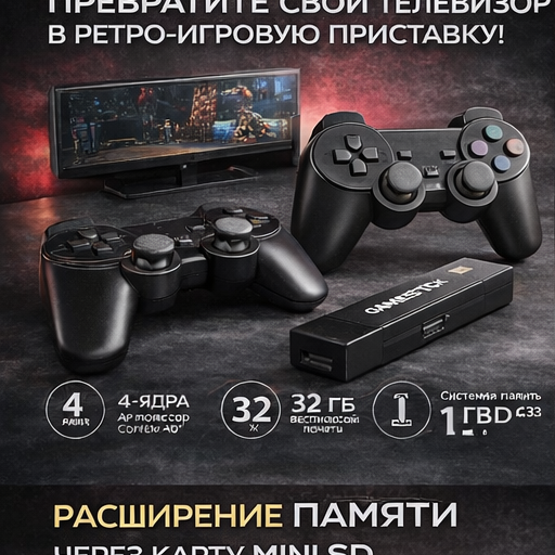 Игровая приставка GameStick 3D HDMI с двумя беспроводными геймпадами для телевизора: сравнение цен, характеристики, фото, актуальное наличие и цены.