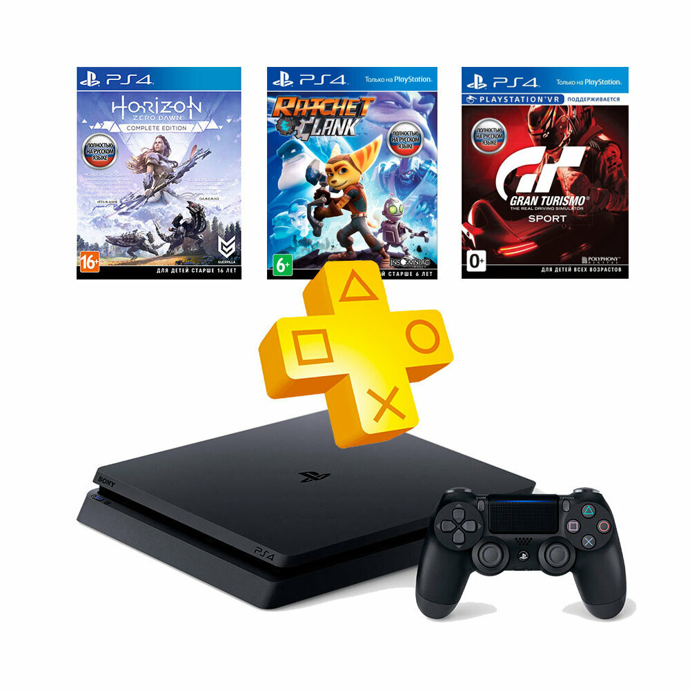 Купить Игровая приставка Sony PlayStation 4 Slim 1TB + Gran Turismo Sport + Ratchet & Clank + Horizon: Zero Dawn + PS Plus с доставкой по всей России.
