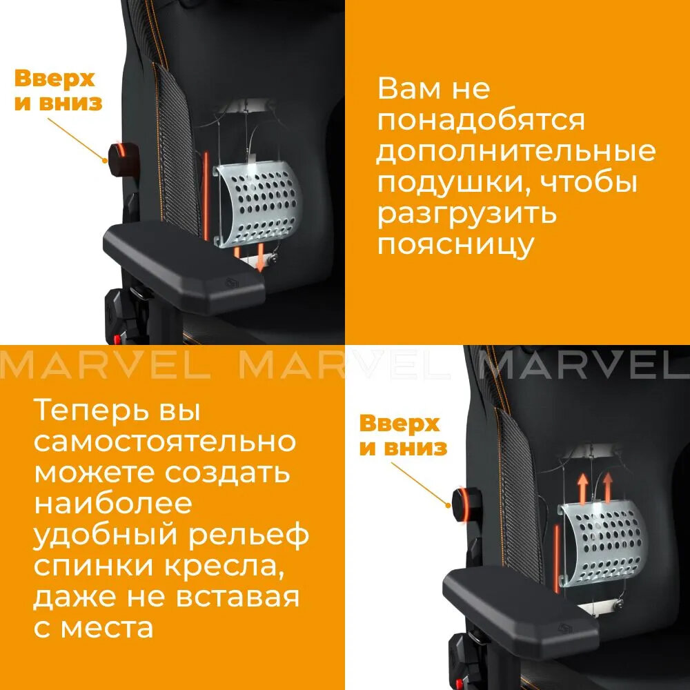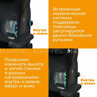 | Регулировка | угла подлокотников, высоты подлокотников, высоты спинки, высоты подголовника, наклона спинки, высоты сиденья, глубины сиденья, расстояния между правым и левым подлокотником, жесткости качания, глубины положения подлокотников, высоты поясничного упора |