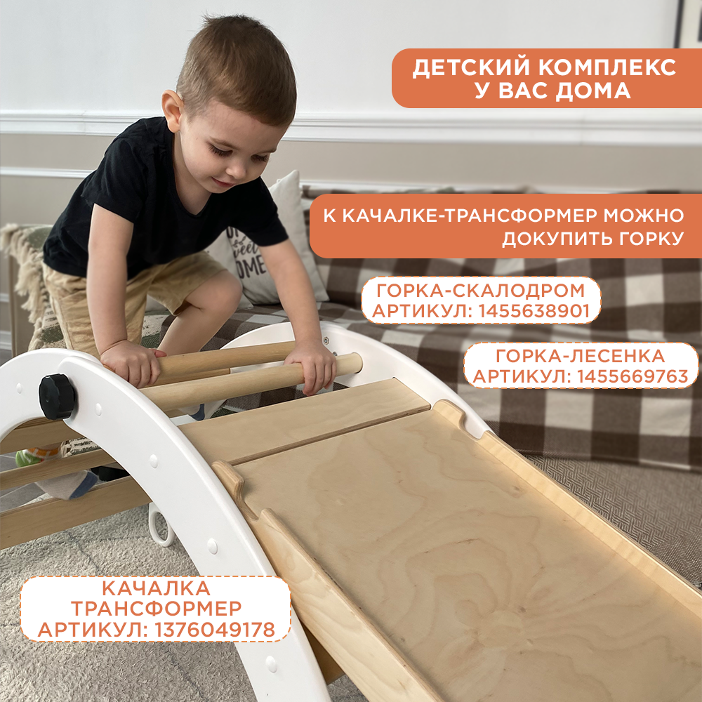 К качалке-трансформер можно докупить горку: Горка-лесенка с бортиками без покрытия - 551336705 Горка-скалодром бортиками без покрытия - 551333229