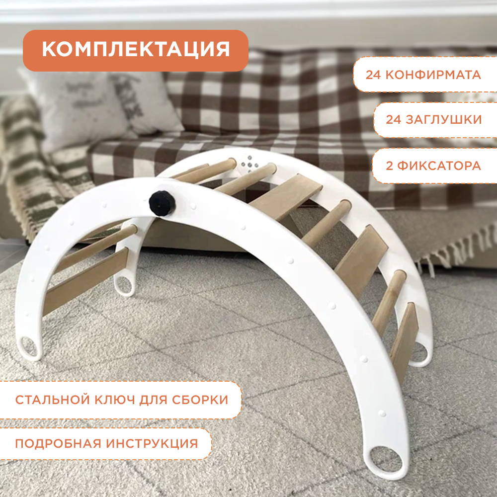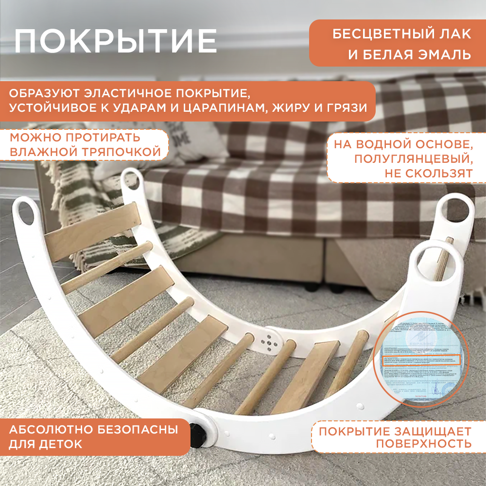 Качалка-трансформер - отличный подарок на долгие годы, который не оставит равнодушным ни одного ребёнка. Каждый малыш найдет игру по своим интересам. Ведь многофункциональная качалка 4в1 объединяет в себе мостик, качели, горку, балансир и всё то, на что ещё способна детская фантазия. Улучшенный дизайн, новые размеры и две секции сделали радугу-качалку более функциональной, что особенно важно для семьи с несколькими детьми разного возраста. Для самых маленьких качалка-мостик служит опорой и помогает сделать первые шаги. В 3-4 года качалка-горка - это часть сюжетно-ролевых игр с кучей идей от баррикады до стойки магазина. В 4-5 лет качалка-балансир помогает найти баланс и уверенно себя чувствовать на велосипеде, при хождении по бревну или поребрику. Ну и основная функция - качели, на которых так весело качаться. Все детали тщательно отшлифованы, имеют гладкую поверхность. Геометрия балансира исключает его переворот. Качество и безопасность подтверждается сертификатом соответствия.