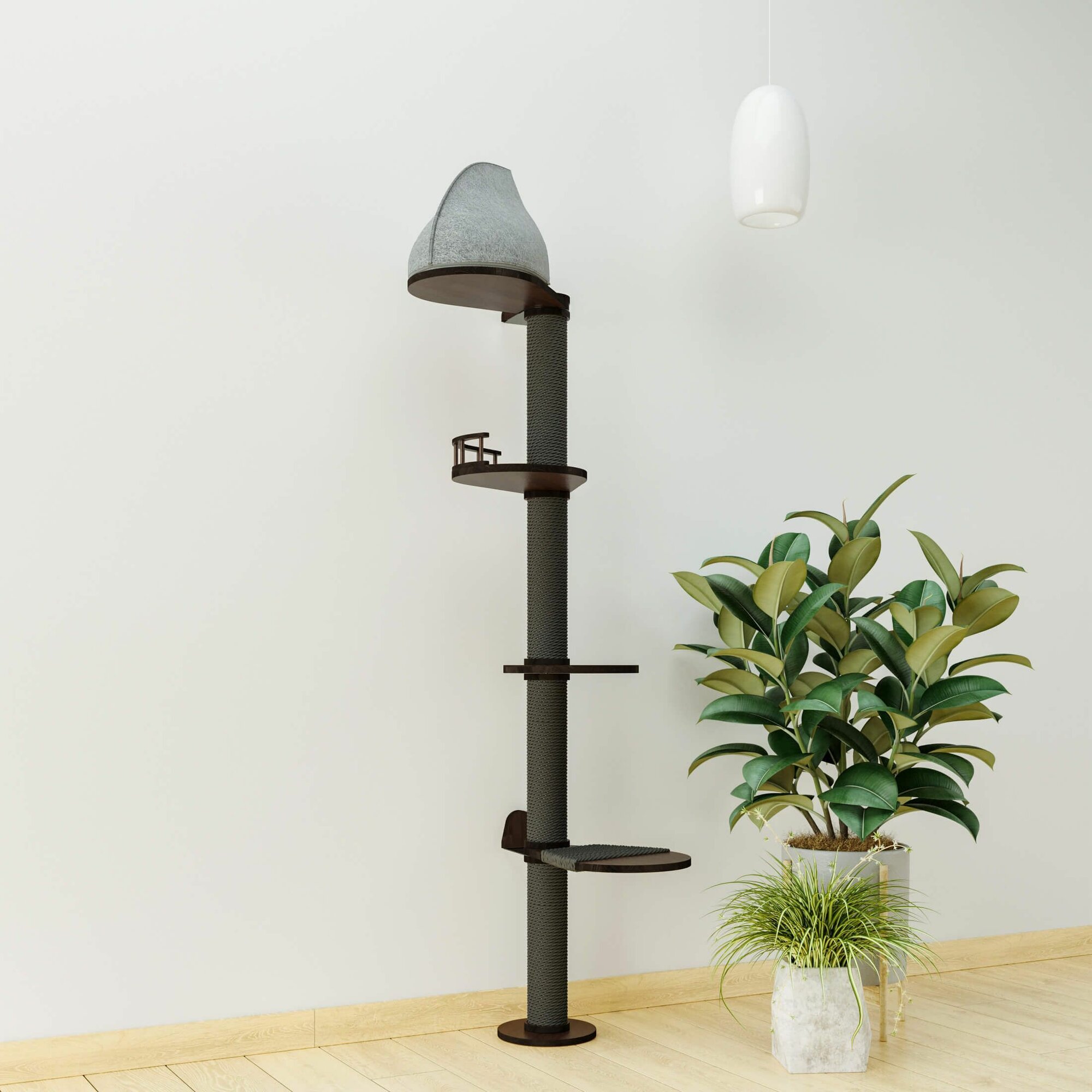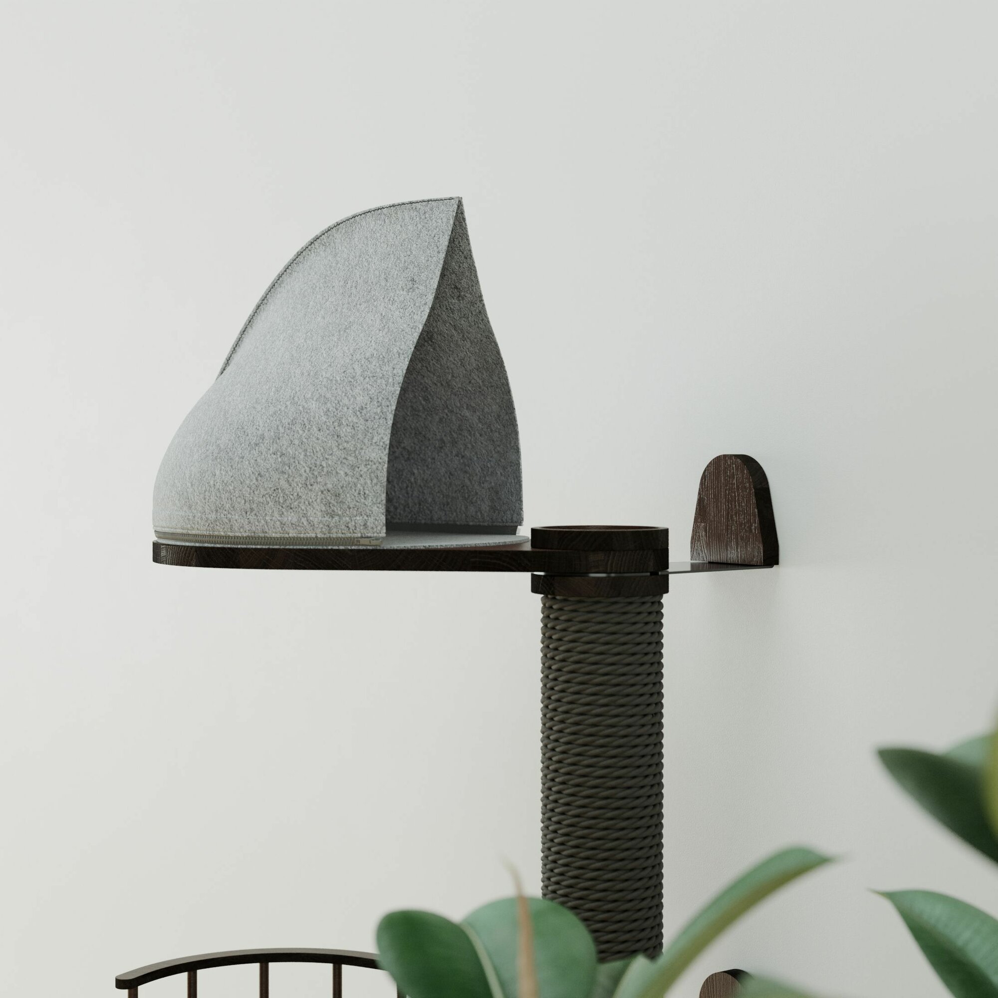 Комплекс VINE устанавливается на пол и крепится к стене с помощью двух кронштейнов. Кронштейны закрываются декоративными крышками на мощных неодимовых магнитах. Не будет видно ни одного крепёжного элемента. Крышки невозможно случайно сбить лапой. Чтобы их снять нужно приложить усилия. Комплекс занимает минимум места на полу, вписывается в дизайнерский интерьер, радует вашего питомца и ваших гостей.