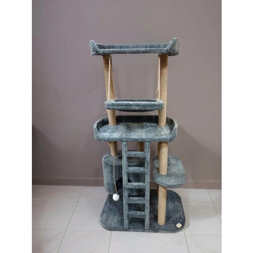 Игровой комплекс когтеточка сделан из высококачественных, экологически чистых материалов. Благодаря современному сочетанию цветов, он прекрасно впишется в интерьер вашего дома и очень порадует острые коготки вашего питомца! Комплекс очень крепкий и устойчивый! Столбики изготовлены из цельного бревна диаметром 7-8см. Прочный джутовый канат 8мм, проклеен по всей длине столбика. Высококачественный ковролин, а не мех. Размер основания 90х60см, все углы скруглены. У лежанок есть бортик для удобства вашего питомца, верхняя лежанка 75х50см, нижняя лежанка 75х35см, полочка рядом с домиком 60х30см. Домик 50х35х35см. Высота от пола до нижней лежанки 90см, от пола до верхней лежанки 150см, общая высота комплекса с учетом бортика 175 см. Гамак на подвесах доставит много радости вашему питомцу. Очень простая сборка!