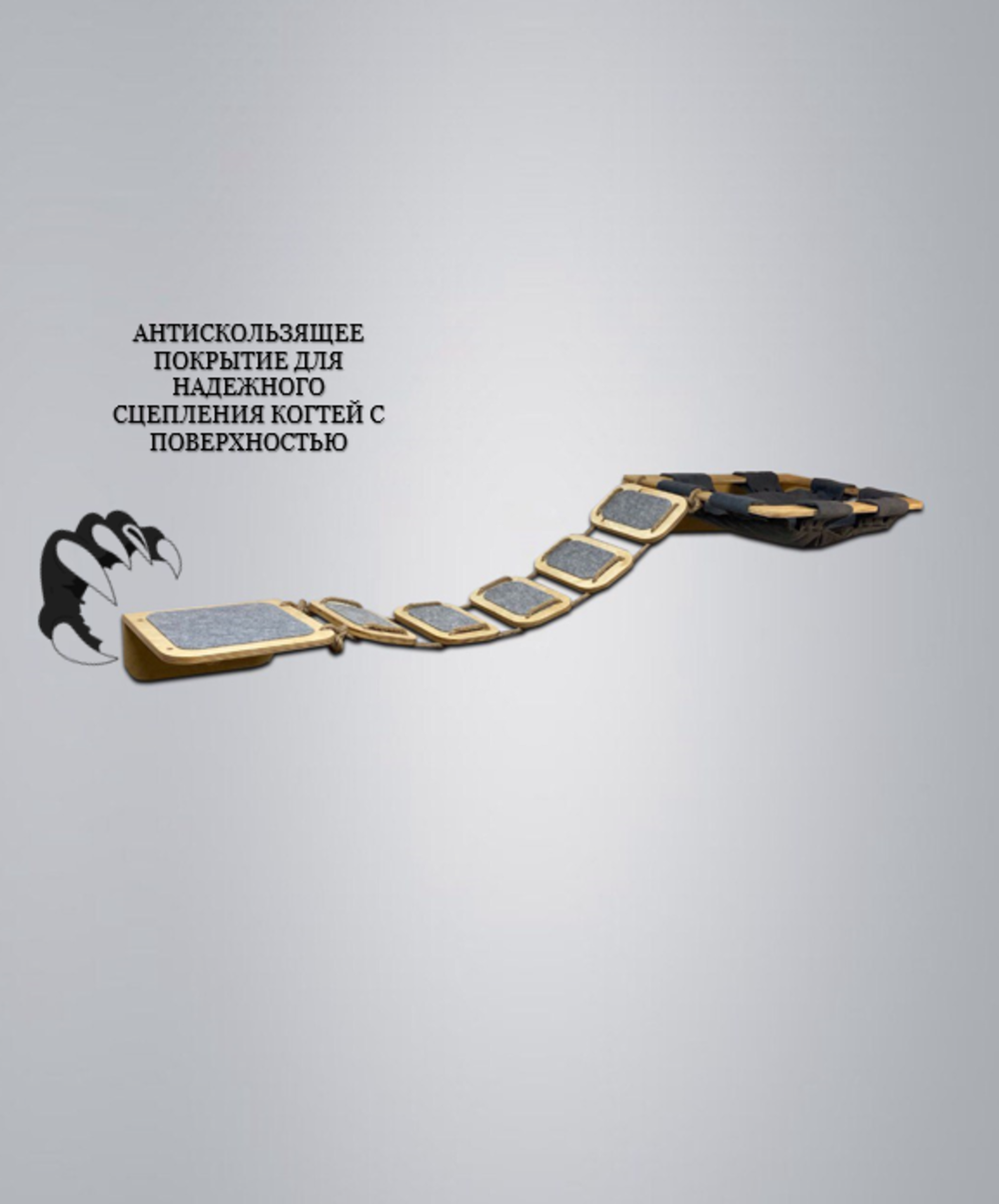Игровой комплекс для кошек выполнен из натурального дерева (березовая фанера высшего сорта, покрыта маслом, применяемым для кухонных столешниц и детских изделий), антискользящего покрытия, джутового каната и мебельной ткани.
