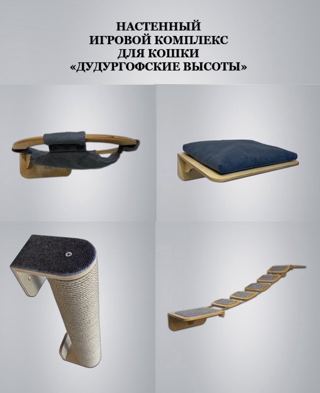 Концептуальные игровые комплексы для кошек. Настенный игровой комплекс "Дудергофские высоты" - это функциональная, качественная мебель для вашего питомца, которая прослужит многие годы. Комплекс крепится к стене, выдерживает нагрузку до 15 кг. Каждый элемент комплекса продуман до мелочей: * лежанка с подушкой на двусторонней липучке против скольжения (чехол съемный, можно стирать), * гамак на 12 кнопках, съемный, * мостик с антискользящим покрытием для безопасности питомца, возможность регулирования длины и сложности прохождения маршрута (для поддержания питомца в хорошей физической форме) * когтеточка столбик имитирует лазание по деревьям, защищает мебель от царапин (блоки сменные). Настенная лазалка для кошек позволяет активным кошкам выплеснуть энергию, а кошкам, набравшим лишний вес - сборить его. Идеально подходит для активных игр с кошкой. Комплекс экономит место в доме за счет настенного крепления, не мешает роботу пылесосу делать свою работу. Лежанка обеспечивает уединение от маленьких детей и домашних питомцев, точку обзора (тк кошки любят возвышенности), тепло (тк теплый воздух поднимается вверх). Комплекс покрыт маслом, безопасным для питомцев. Отлично смотрится в интерьере. Цвет дерева - натуральный (бесцветное масло), ткань мебельная - цвет серый "wet stone". Размеры: гамак 50х53 см, лежанка 48х36 см, когтеточка 62х11 см в сборе, мостик площадки 25х25 см (2 шт), ступеньки 13х20 (5 шт).