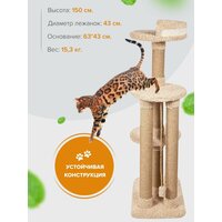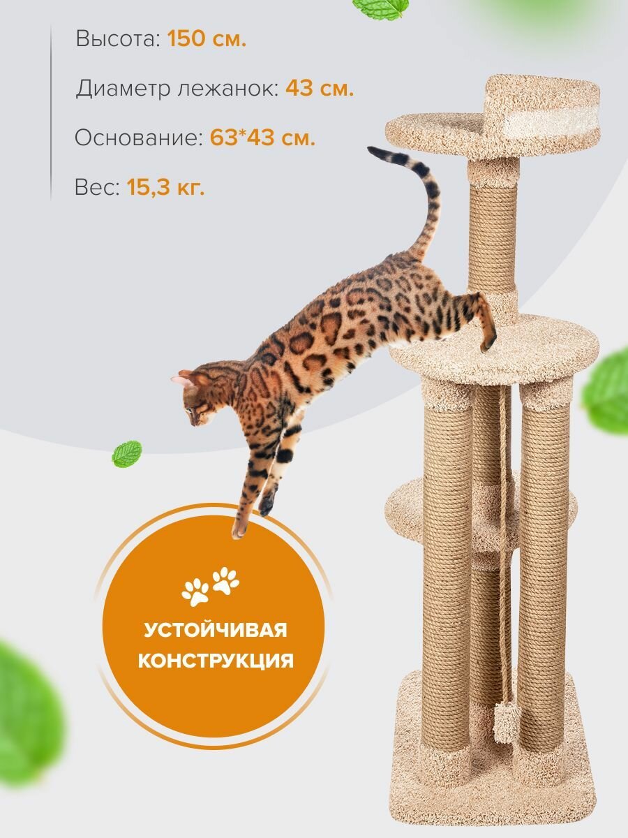 Высокий столбик диаметром 10 см с плотной обмоткой из джута, с лежанками из мягкого долговечного ковролина отлично подойдет как для взрослого крупного кота, так и для маленьких игривых котят. Изделие на подставке устойчивое и безопасное.