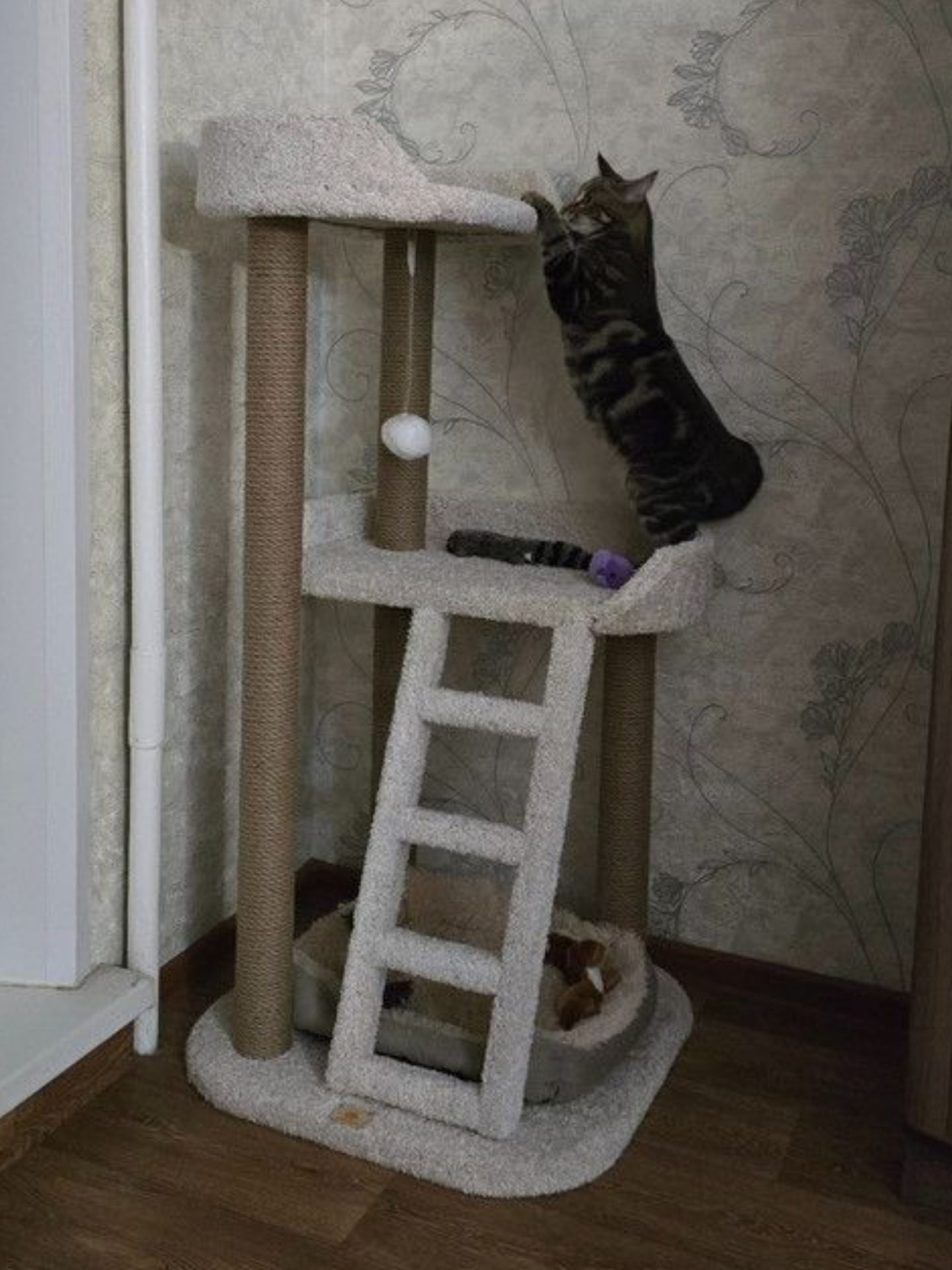 Точилка для когтей поможет вашему cat драть когти о деревянный столбик, а кровать для отдыха станет любимой. Большая настенная когтеточка может крепиться на стену. Напольная конструкция позволяет установить в любом месте, где есть свободное пространство, станет квартирой для кота. Также в комплексе есть кроватка для кошек, на которую ваш питомец может запрыгивать и наблюдать за происходящим в комнате.