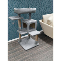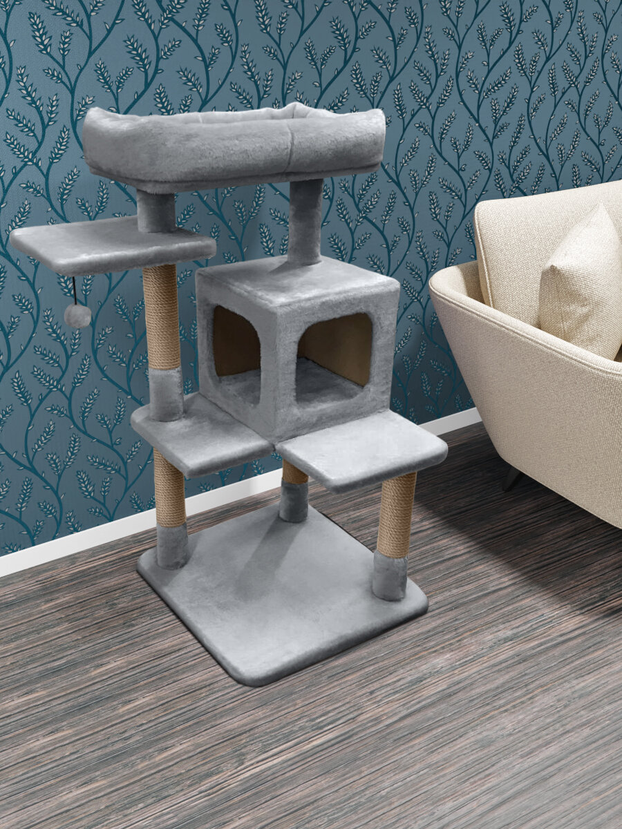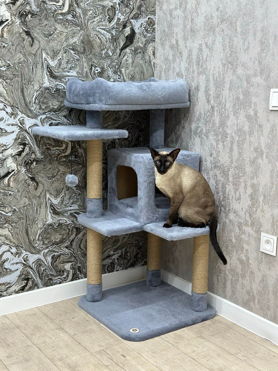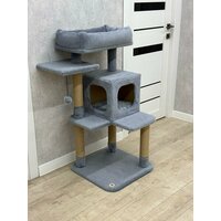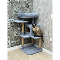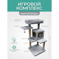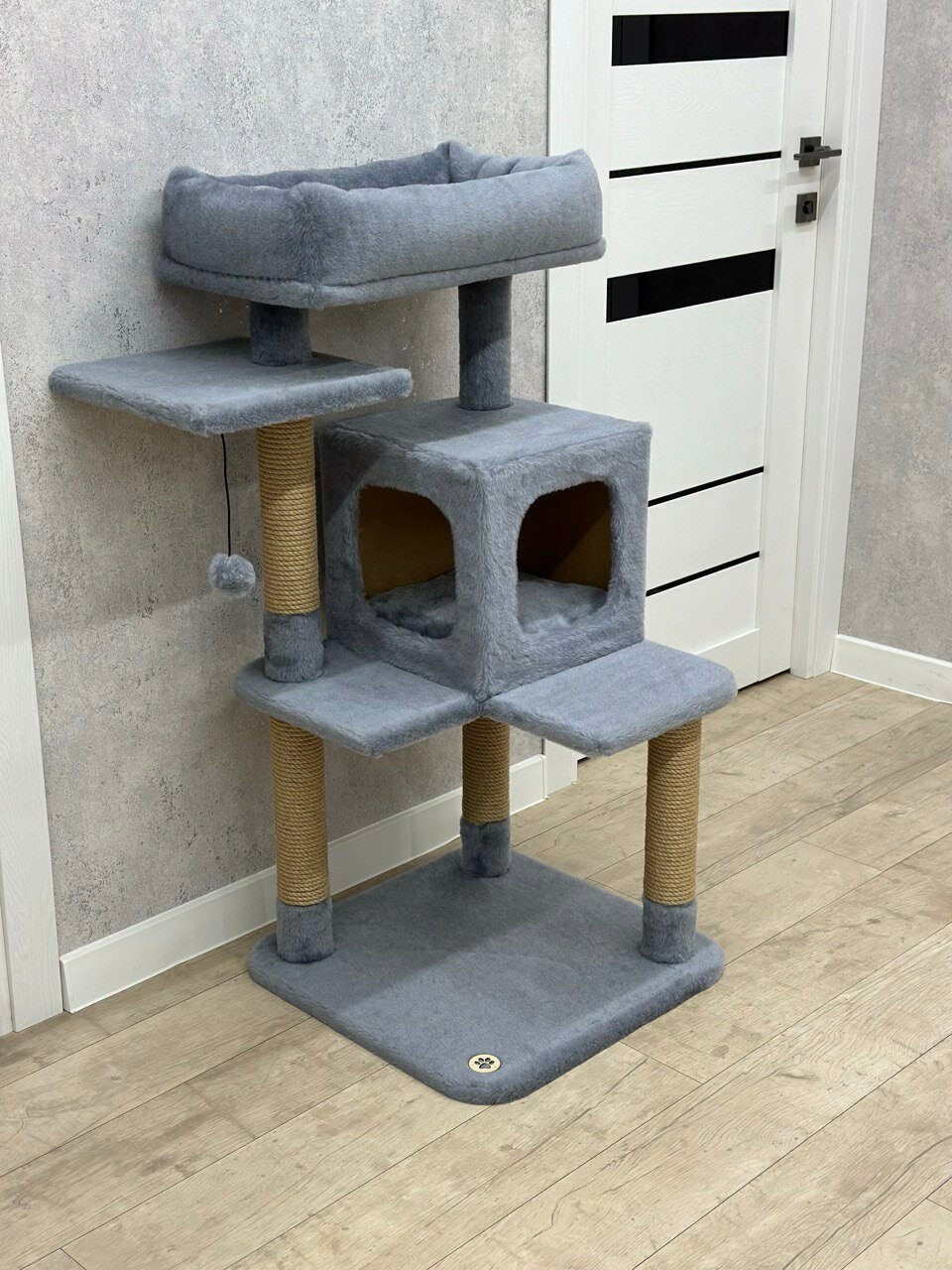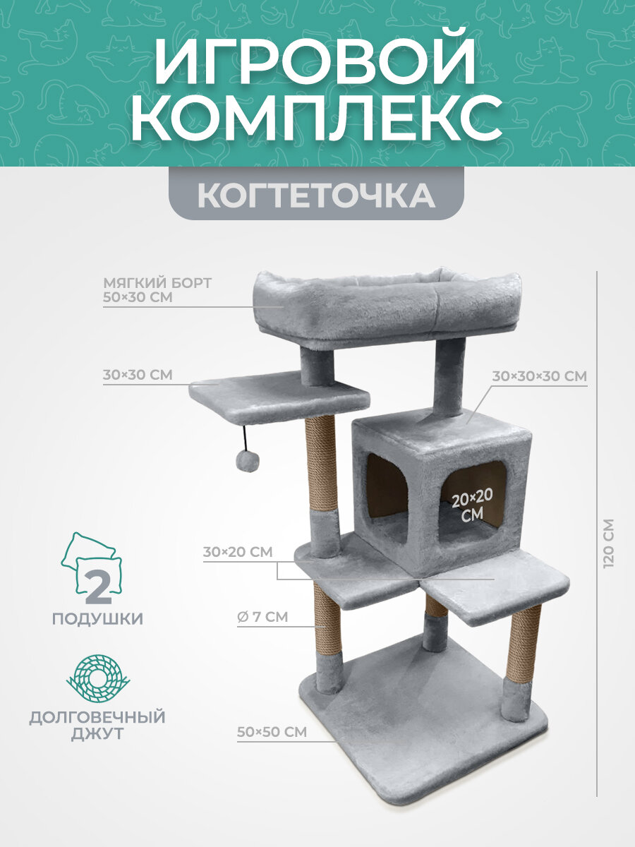 Игровой комплекс с когтеточкой, лежанками и домиком для кошек и котов, где питомцам можно свободно прыгать, лазать, точить когти или отдыхать. Подходит для котят, мелких и средних пород кошек! (на видео и фото кот весом 4,5 кг). Верхняя лежанка с мягкими бортами и подушкой. Домик изготовлен из высококачественного ДСП, снаружи обит мягким искусственным мехом, внутри находится мягкая подушка чтобы держать любимых питомцев в тепле и уюте. Столбики, обмотанные натуральной джутовой верёвкой, уберегут мебель от острых когтей. Уютное и комфортное место для сна. Мягкие лежанки, уютный домик, игровая площадка с подвесной игрушкой подарят подарит много радости питомцу. Игровые комплексы YUGA – это исключительный комфорт для питомца, качество материалов и дизайн. Размеры (ДхШхВ): 50х50х120см. Цвет: серый.