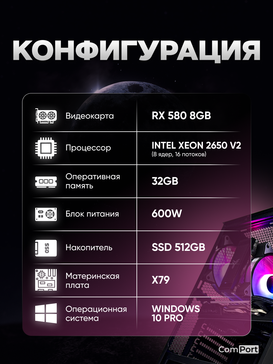 Основные характеристики: Процессор: Intel Xeon E5-2650v2 (8 ядер по 2.6-3.4 ГГЦ) — обеспечивает высокую производительность и быструю работу системы. Оперативная память (RAM): 32 ГБ — позволяет одновременно работать с несколькими приложениями без потери скорости. Накопитель: SSD на 512 ГБ — обеспечивает быструю загрузку операционной системы, приложений и игр. Графическая карта: AMD Radeon RX 580 (8 ГБ) — позволяет наслаждаться графикой высокого разрешения и играть в современные игры на высоких настройках. Операционная система: Windows 11 Pro — предлагает широкий спектр возможностей и удобство использования.