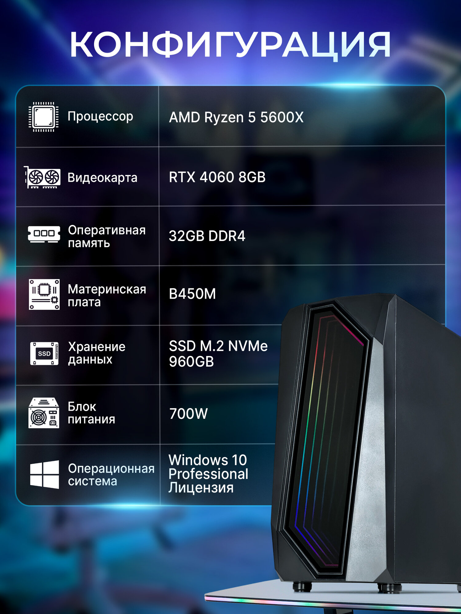 AMD Ryzen 5 5600X / 32GB DDR4 3000Mhz / SSD 960 PCI-E / RTX 4060 8Gb / B450M / 700W / Windows 10 Pro / Гарантия 3 года