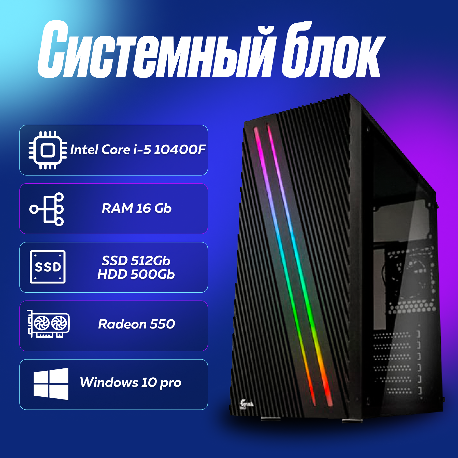 Игровой компьютер, системный блок Intel Core i5-10400F (2.9ГГц)/ RAM 16Gb/ SSD 512Gb/ HDD 500Gb/ Radeon 550/ Windows 10 Pro: сравнение цен, характеристики, фото, актуальное наличие и цены.