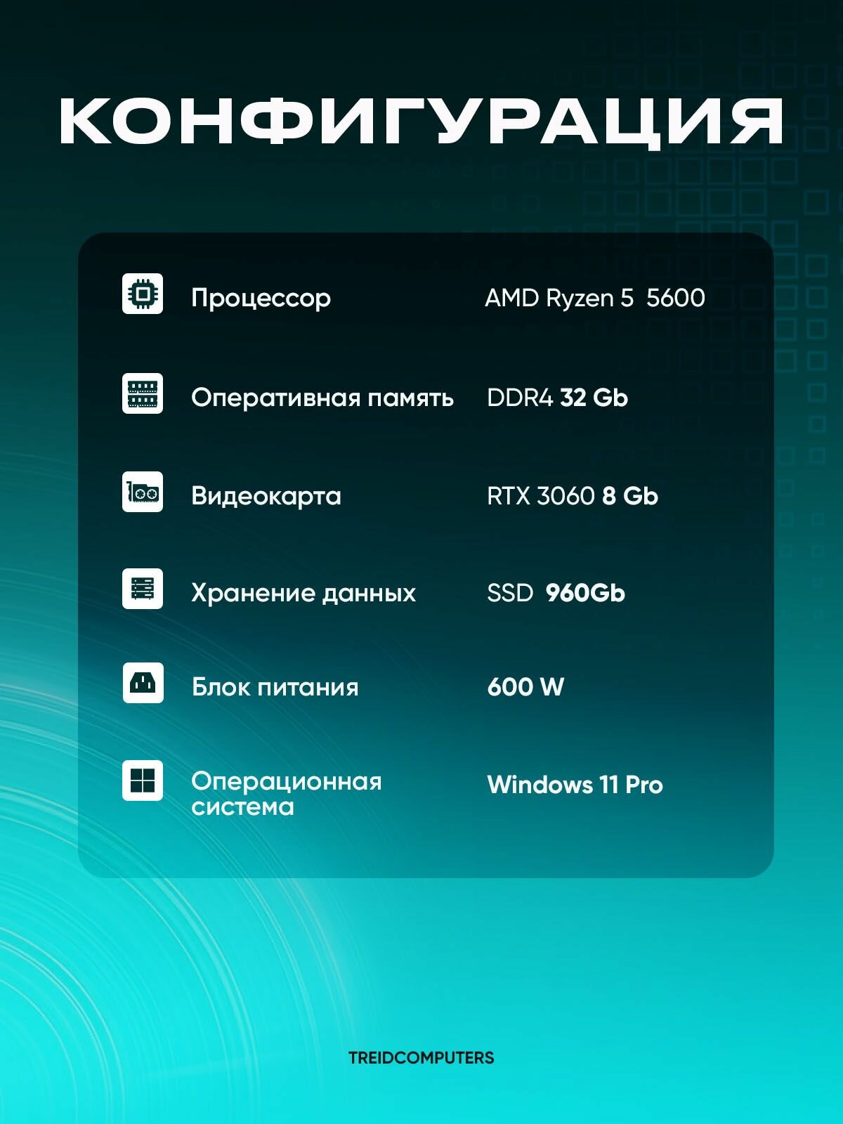 Игровой компьютер Treidcomputers Ryzen 5600, RTX 3060, 960/32GB черный: сравнение цен, характеристики, фото, актуальное наличие и цены.