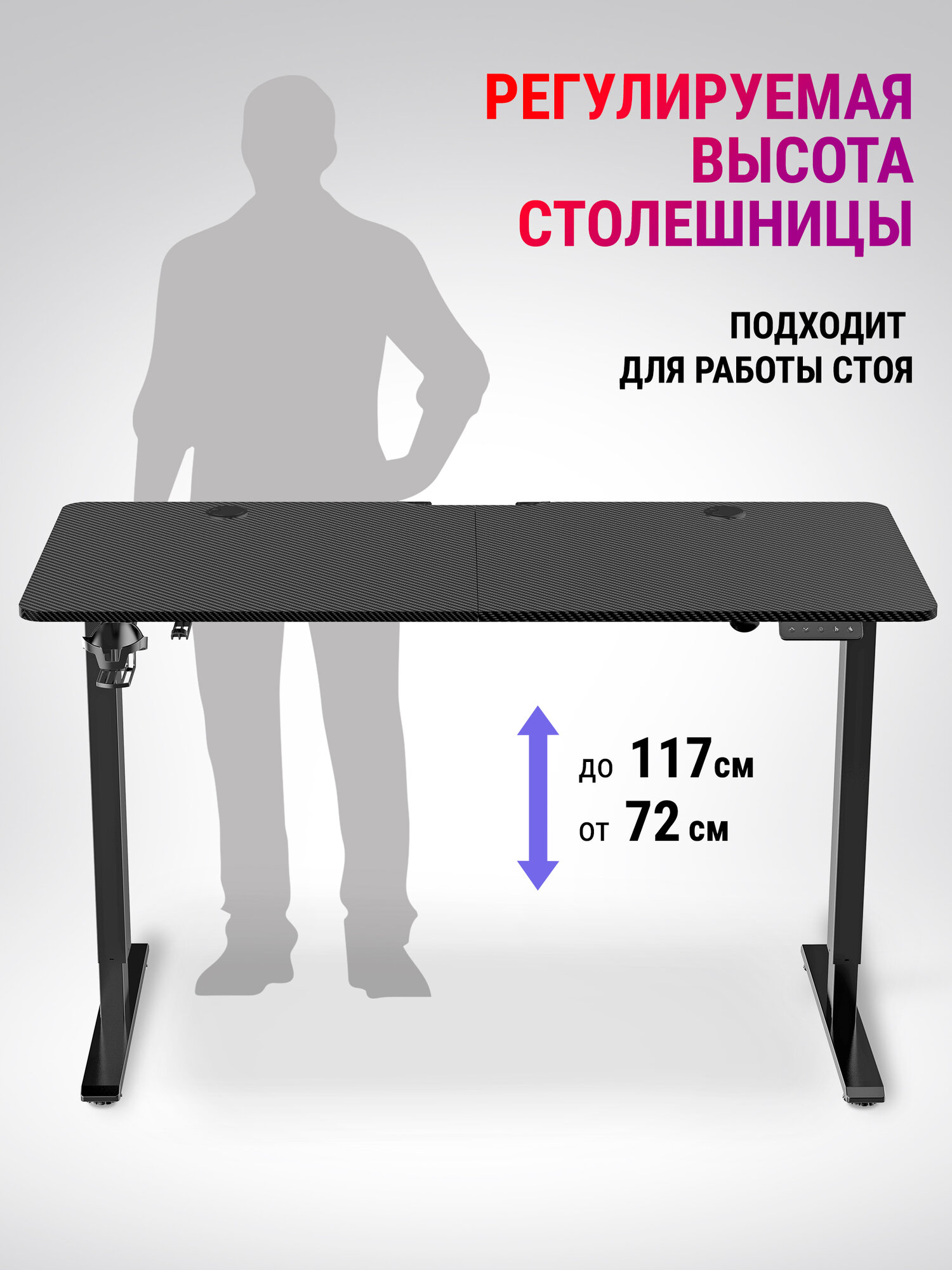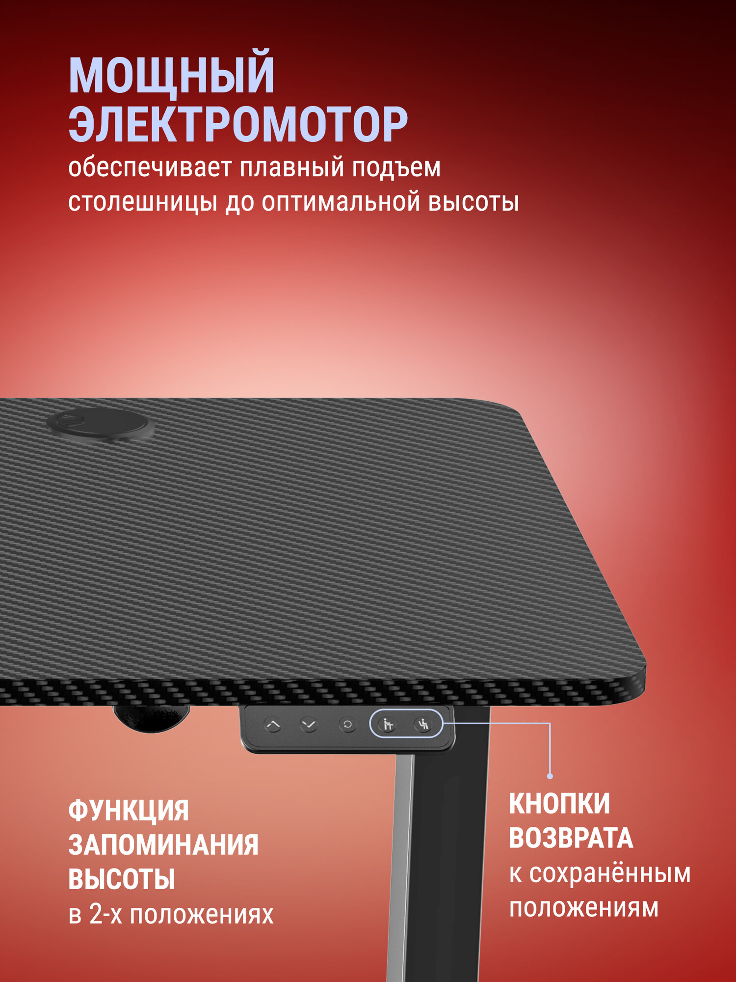 столешница покрыта прочной меламиновой пленкой с текстурой "под карбон"; в комплект входят держатели для гарнитуры и кружки, в столешнице предусмотрены 2 выхода для проводов; RGB подсветка, управление с помощью пульта