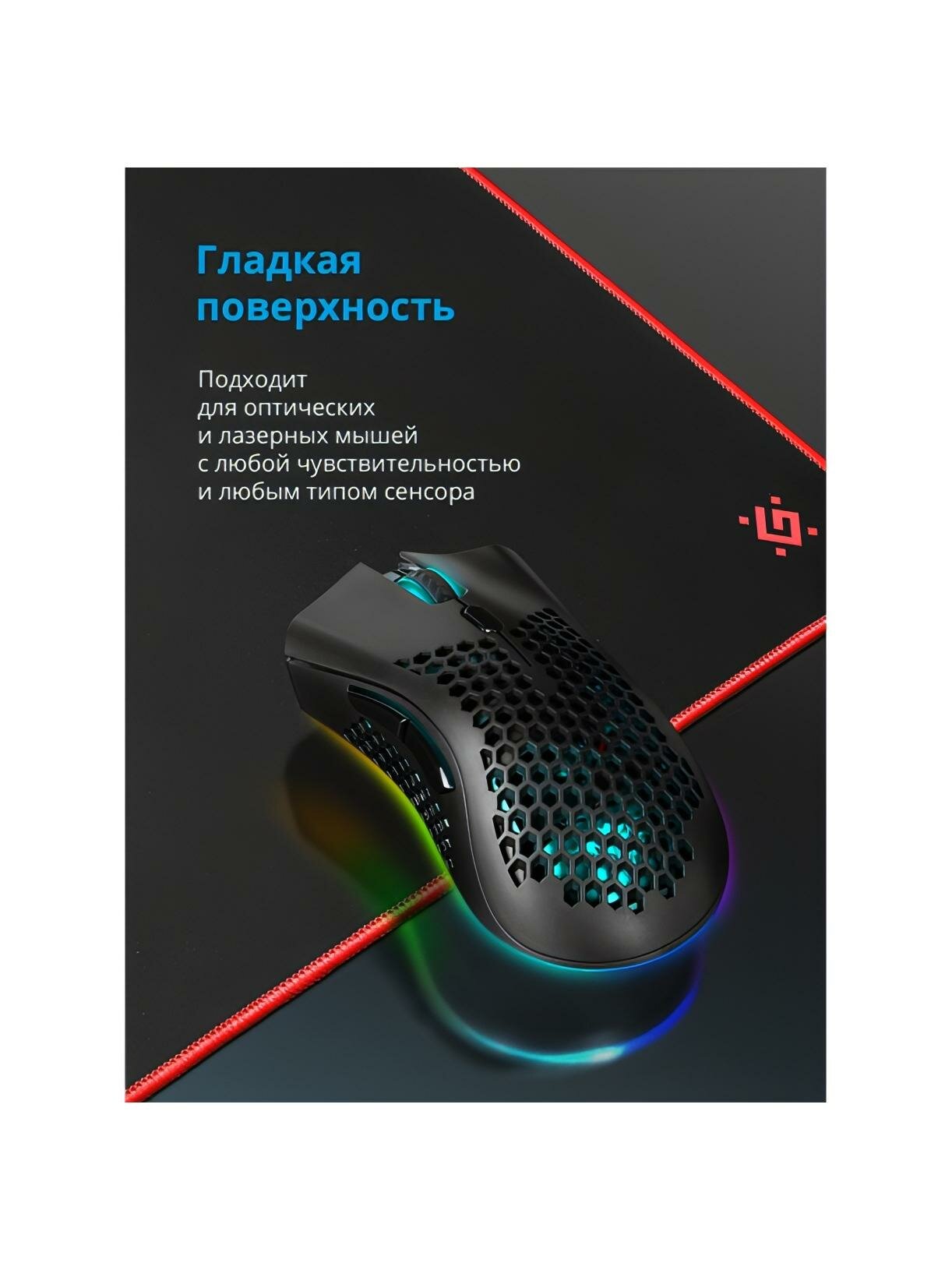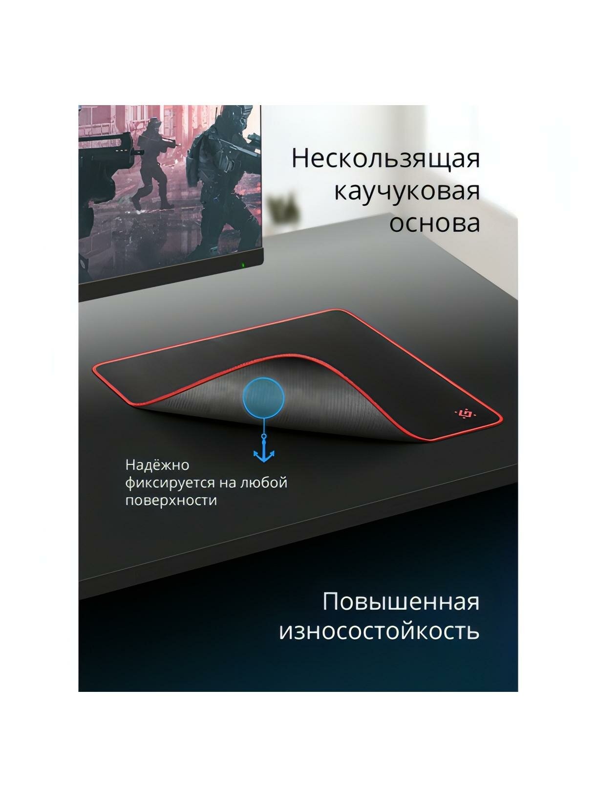 Игровой коврик Defender Black XXL выполнен в черном цвете с красными элементами, что придает ему стильный и современный вид. Вес коврика составляет всего 280 г, что делает его легким и удобным для переноски.