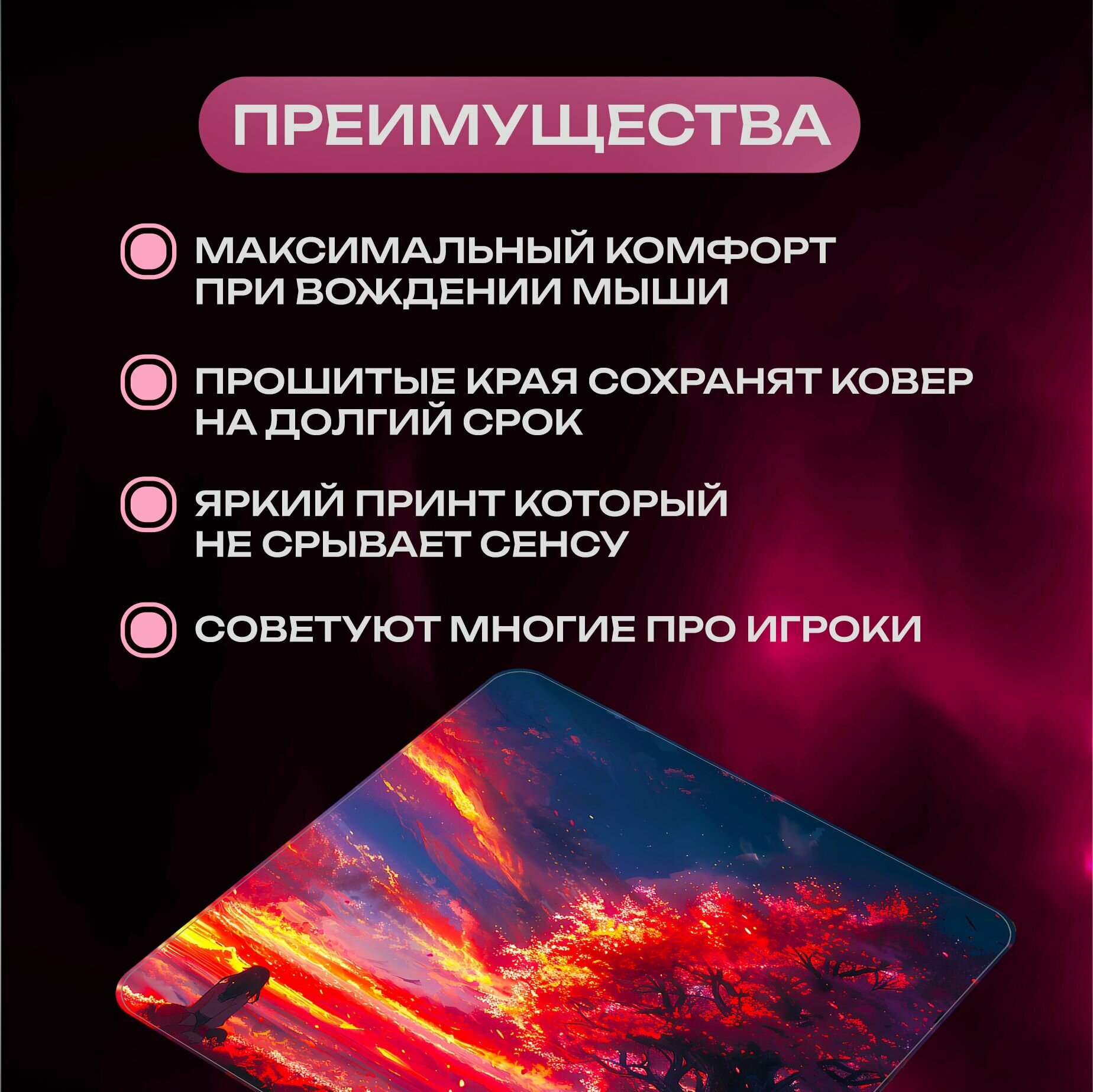 Большой игровой ковер для мыши изготовлен из современного материала, который отличается высокой прочностью, износостойкостью и устойчивостью к истиранию. Коврики обеспечивают плавное и точное скольжение мыши, а также легко поддаются очистке. Большой игровой коврик для мыши, с новой более плотной и крепкой прошивкой краев, отличает оригинальный, стильный, универсальный, в стиле аниме дизайн поэтому не изнашивается, не деформируется при длительном использовании. Геймерский коврик подходящий к любой периферии, придаст вашему рабочему месту стиль в офисе и дома, подходит для всех типов игр, от динамичных FPS-шутеров до масштабных MMORPG и был разработан с учетом мнений профессиональных игроков из CS: GO, VALORANT, DOTA 2, APEX LEGENDS, OVERWATCH, FORTNITE. Большой размер 500x500 мм отлично подойдет каждому пользователю. Удобство и комфорт при работе за ПК или ноутбуком. Является лучшим подарком для геймера. Коврик для мышки оптимизирован для быстрого движения, сохраняя при этом превосходную скорость и контроль во время работы или игры, доступен для беспроводных и оптических мышек. Быстрое скольжение мыши по ковру. Изготовленный из высококачественного материала, данный коврик позволит максимально комфортно ощущать мышь на коврике. Покрытие типа Control на коврах обеспечивает высокий уровень точности и контроля при движении мыши. Оно характеризуется более шершавой и текстурированной поверхностью, что позволяет достичь оптимального сцепления и управляемости. Это покрытие особенно подходит для пользователей, которым необходима прецизионная точность в работе или играх. Сбалансированные характеристики Control делают его универсальным решением для широкого круга задач. Прочная текстурированная основа из резины надежно фиксирует ковер на столе. Хорошо работает на всех типах поверхности. Прошитые края обеспечат отличный вид ковра на долгий срок.