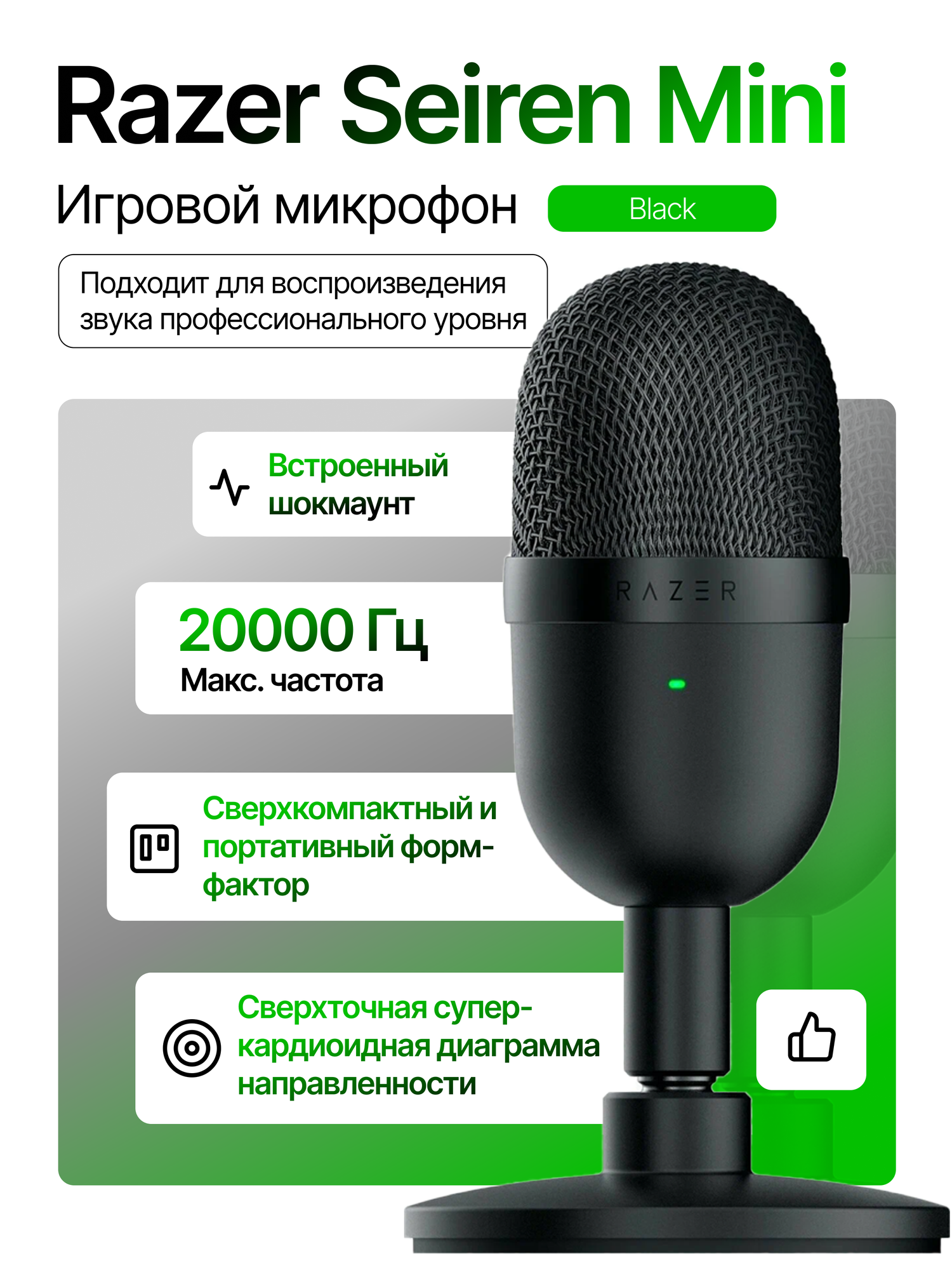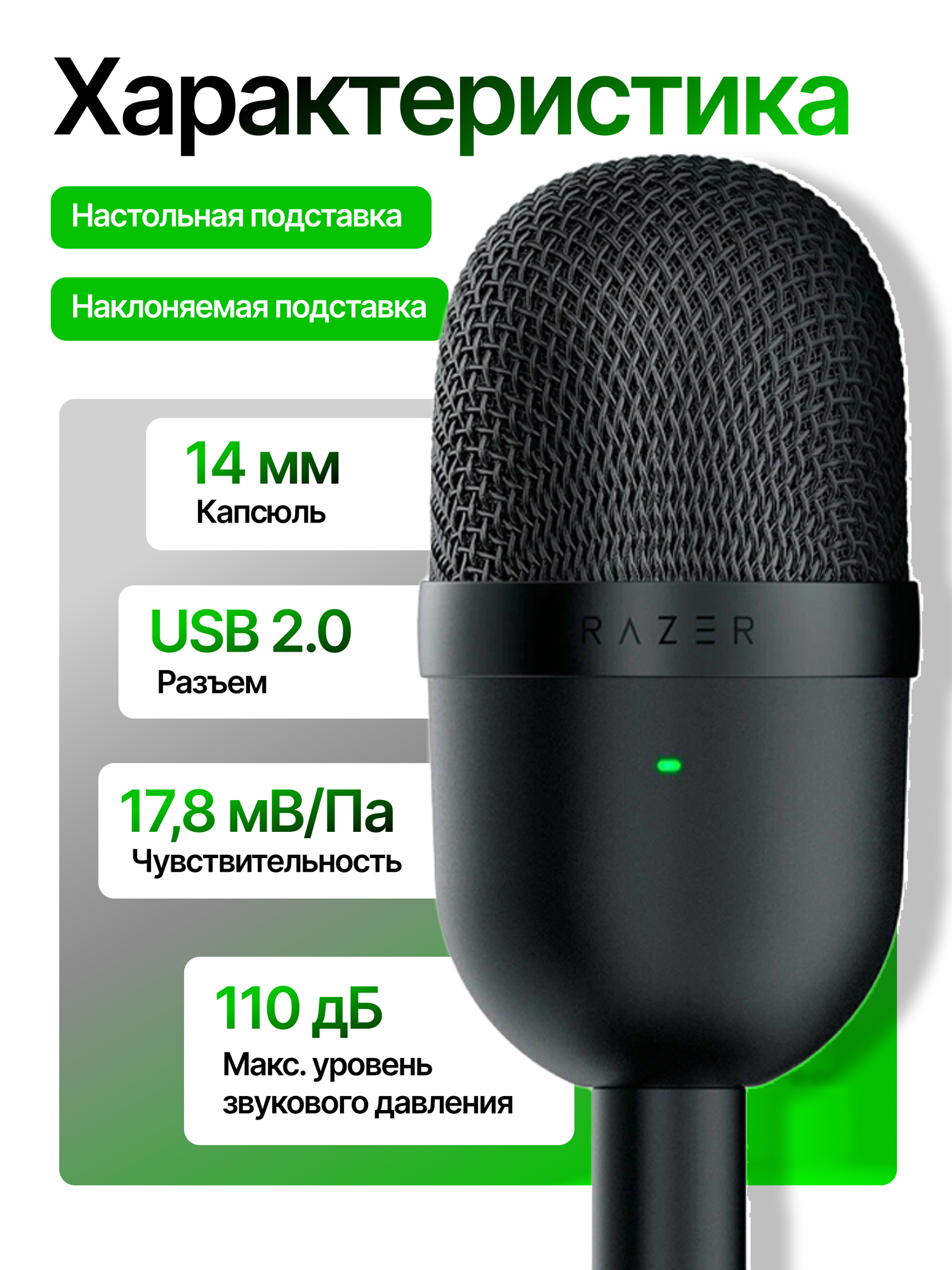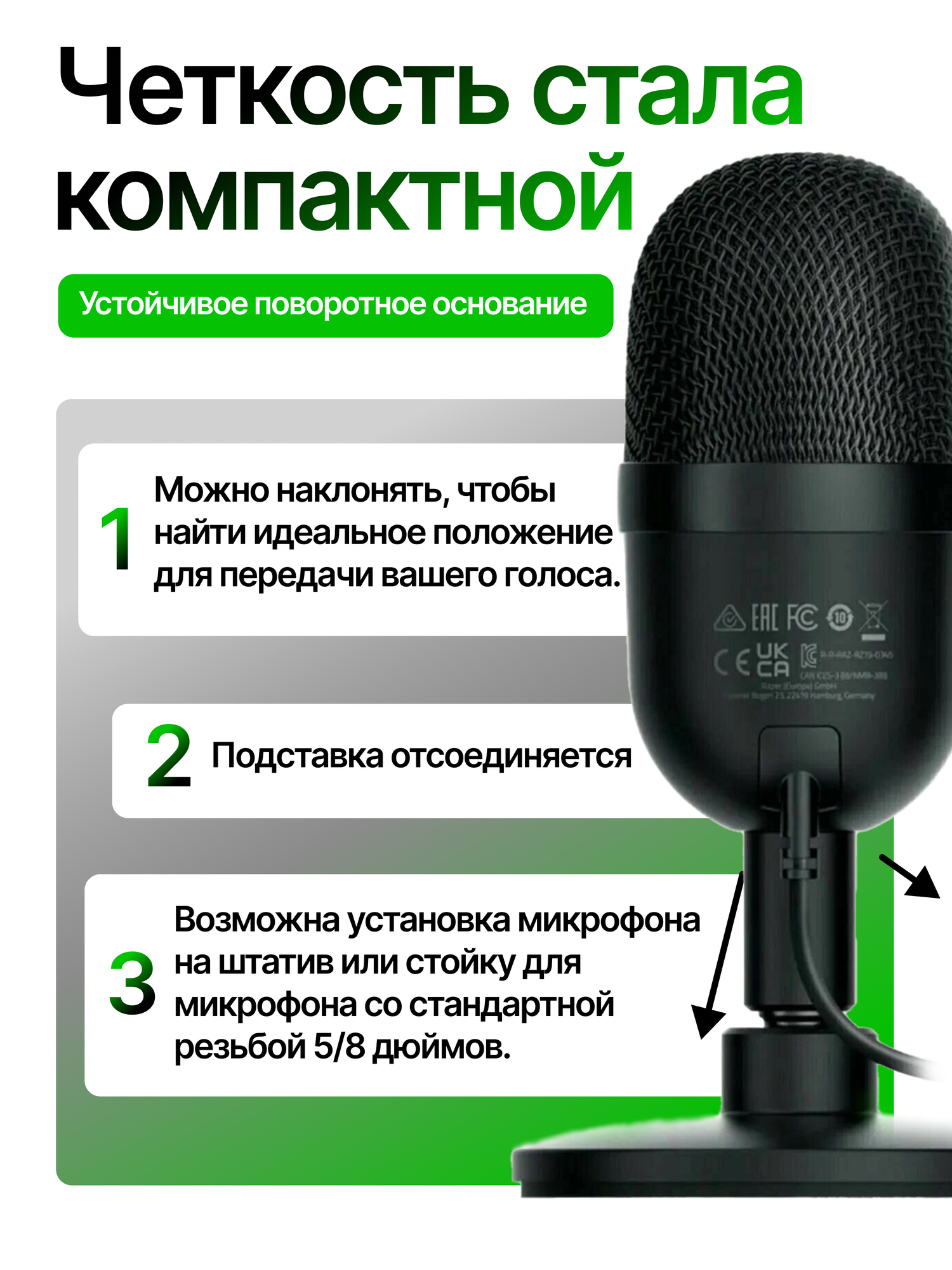 | Подробная комплектация | Микрофон; Опорный стержень; Настольная подставка; Кабель Micro-USB/USB; Инструкция |
