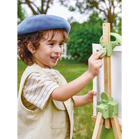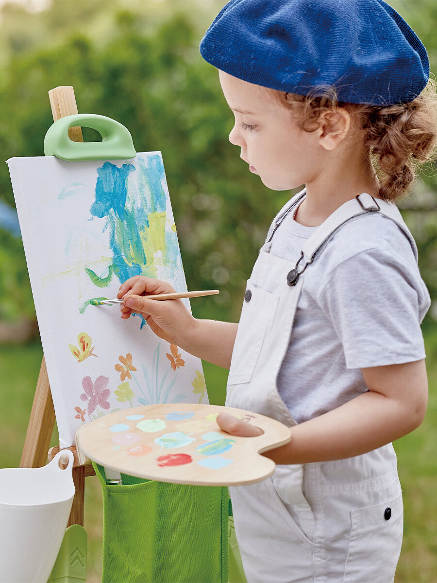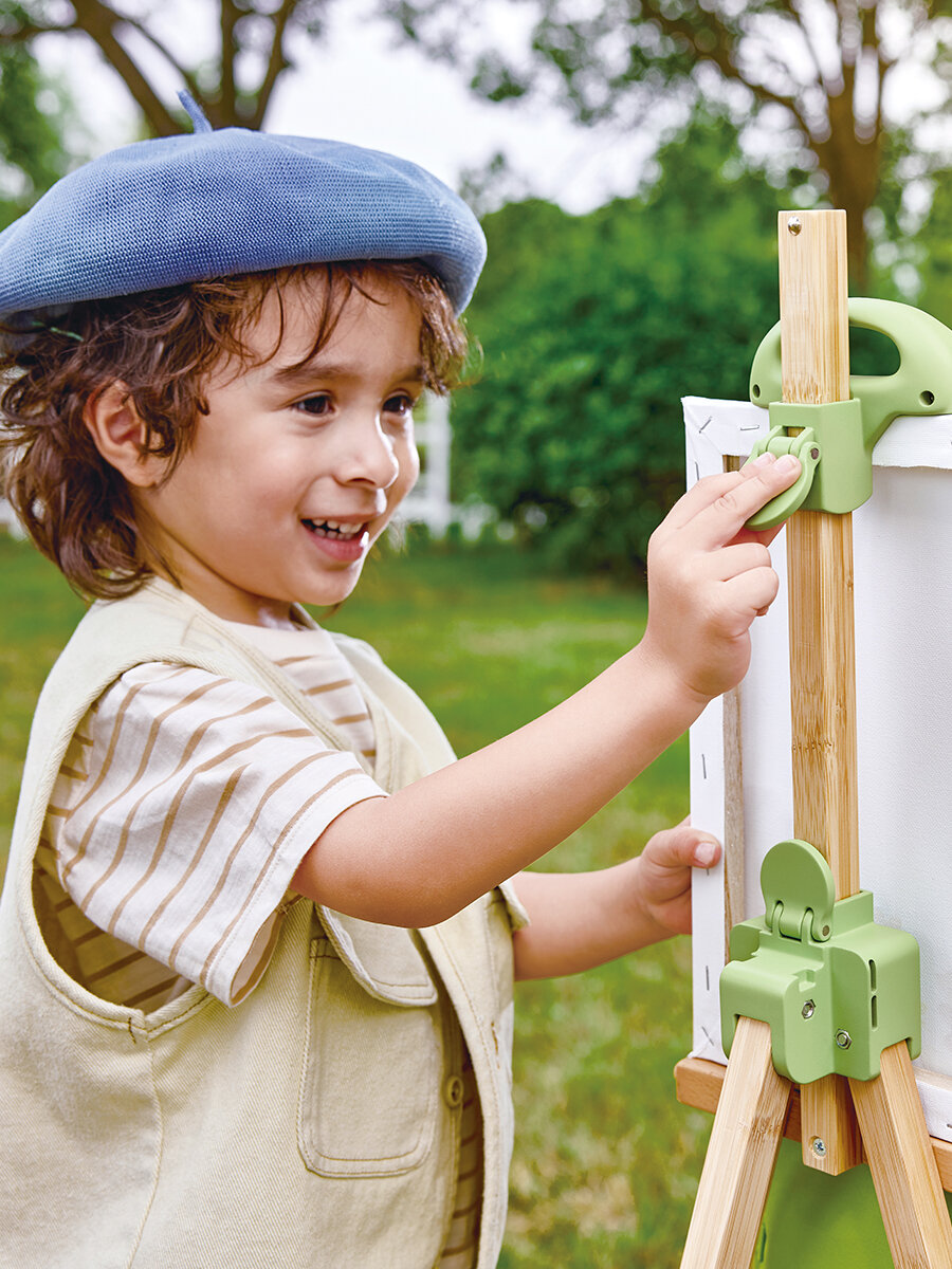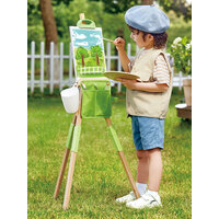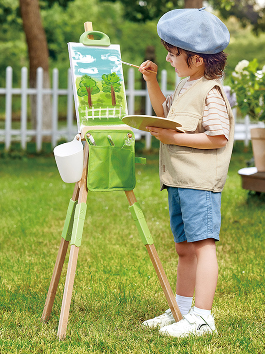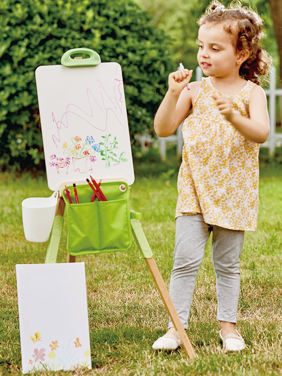 Почувствуй себя настоящим художником! Этот тонкий складной деревянный мольберт можно легко установить и убрать, не отвинчивая никаких винтов. Бумажный рулон и зажимы в углах удерживают бумагу на месте. Ведерко можно использовать для хранения всех ваших художественных принадлежностей, и оно всегда находится в пределах легкой досягаемости. Мольберт можно отрегулировать на три разные высоты в зависимости от роста ребенка.