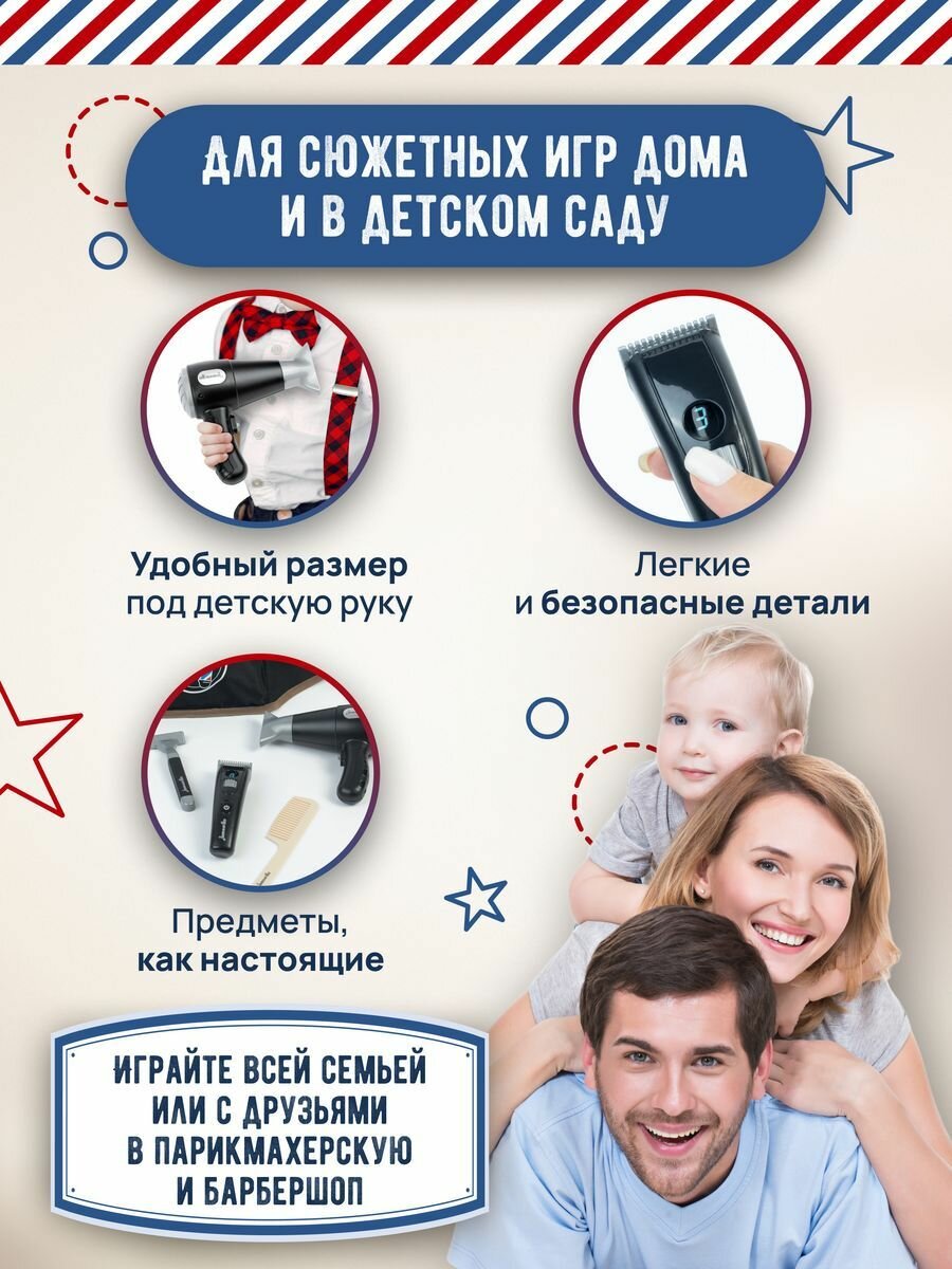 Игровой набор "Барбершоп" стимулирует интерес детей к профессии парикмахера, развивает воображение, чувство стиля и моторику. Это полезный подарок для ребенка, который боится ходить в парикмахерскую или перед первым походом к парикмахеру. Игра поможет побороть страхи и полюбить подстригаться.