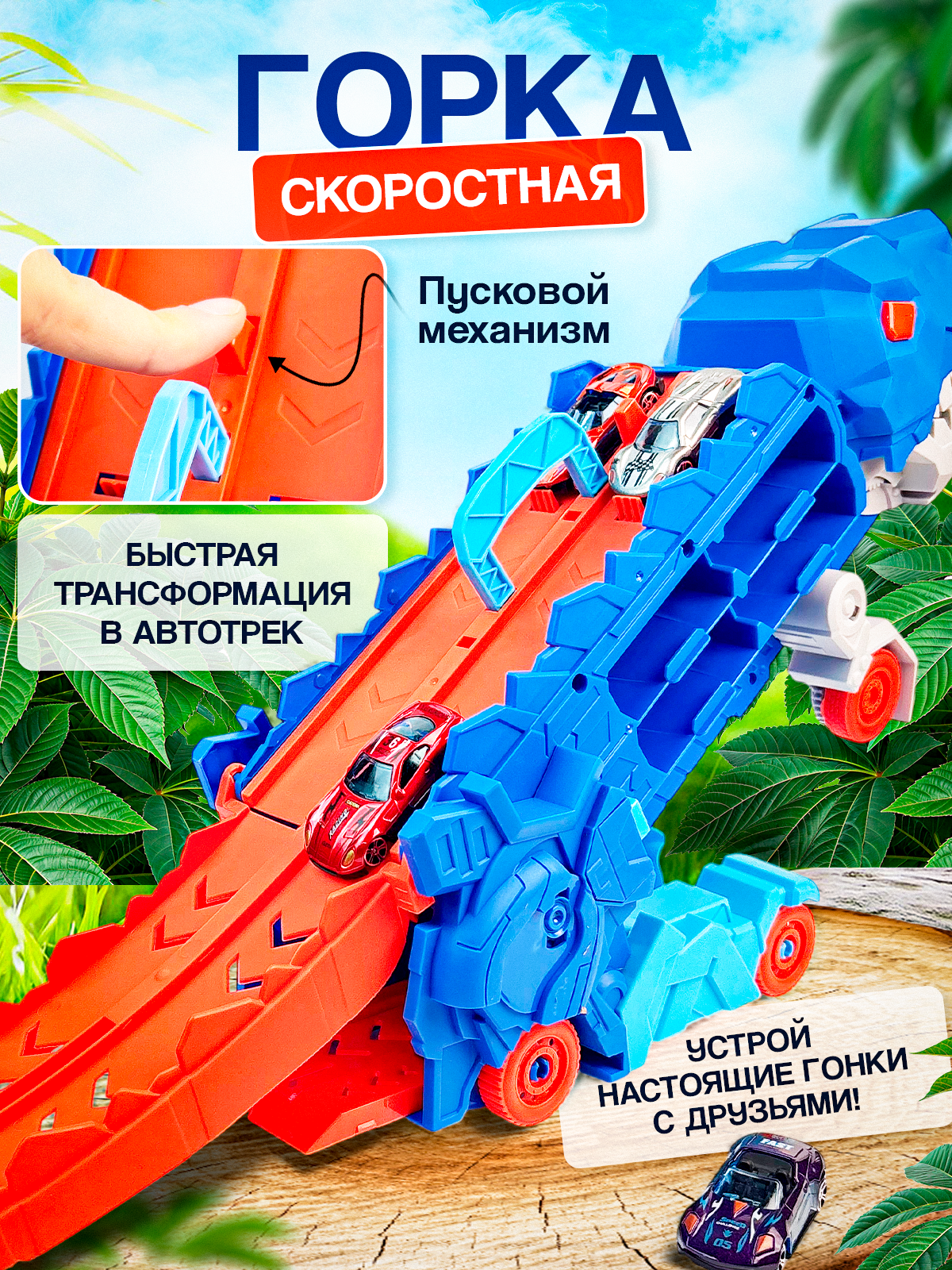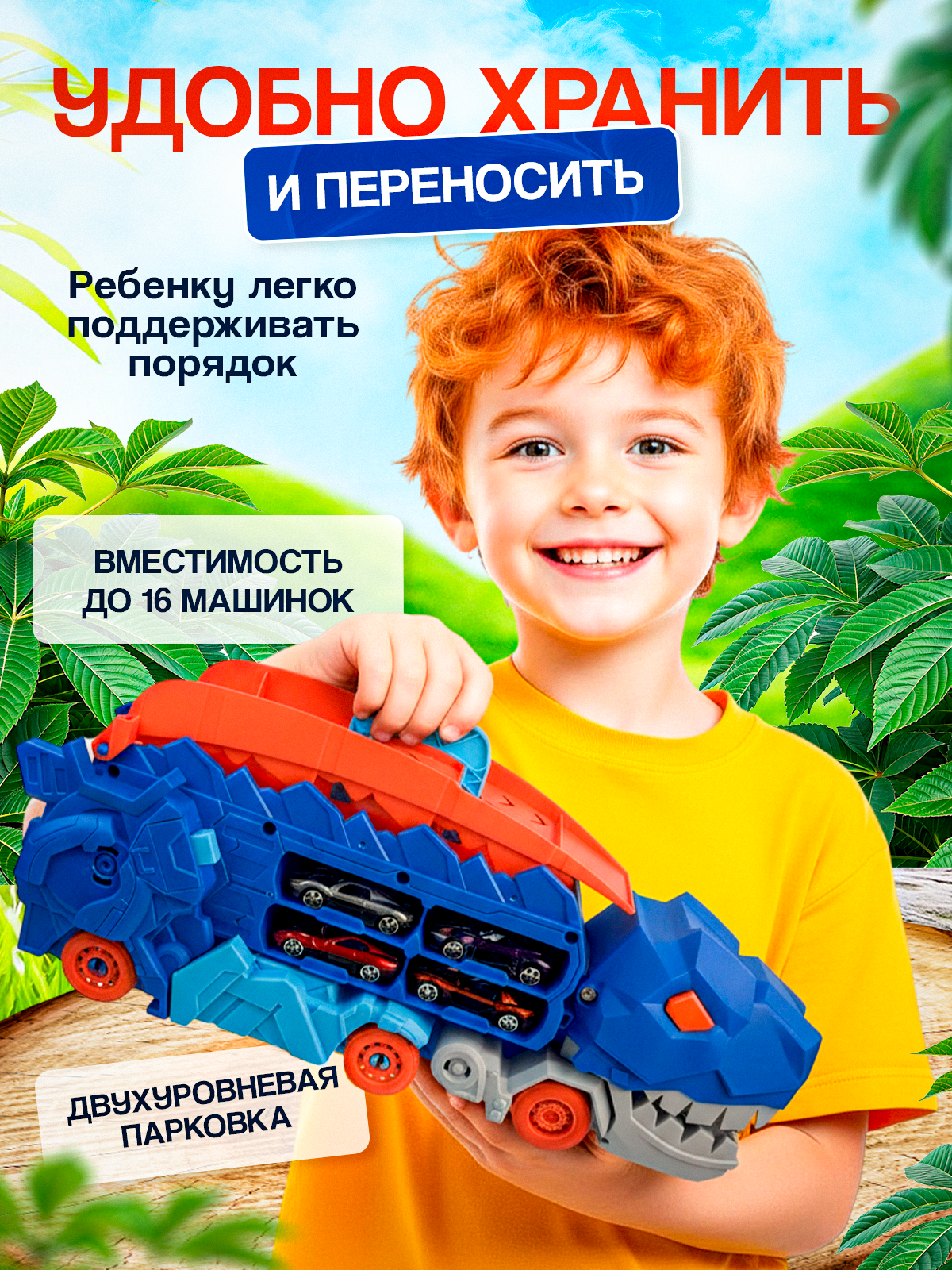 Игровой набор для мальчика и девочки большой динозавр, который обязательно понравится вашему малышу. Автовоз динозавр - это незаменимый выбор для всех маленьких автомобильных энтузиастов. Игрушка трансформер, голодный Тиранозавр Рекс может пожирать машинки, трансформироваться в гараж и автотрек, а также служить отличным боксом для хранения и переноски игрушки благодаря удобной ручке. В комплект игрушки входит набор машинок - 4 шт. В маленькие металлические машинки очень удобно играть, такая автотехника очень нравится маленьким гонщикам. T-rex с гоночной трассой на спине развивает воображение, мелкую моторику, помогает детям развивать фантазию, улучшает концентрацию и внимание. Автовоз с машинками способен проглатывать и выкатывать машинки, а также оснащен четырьмя отсеками, предназначенными для перевозки игрушечных автомобилей. Такой гараж парковка идеально подойдет для хранения и транспортировки машинок. Функции интерактивной игрушки: Подкатите транспортер к машинам и он их съест! Поднимите и поверните хвост, чтобы превратить буксир в робота-тираннозавра, который движется, словно топчет землю. Гоночные машины едут бок о бок на гоночной трассе, проходящей вдоль его позвоночника. Hot wheels динозавр имеет надежную конструкцию и изготовлен из безопасных для ребенка материалов. Монстр трак идеальный подарок маленьким автолюбителям и любителям динозавров. Порадуйте своего ребенка на день рождения, 23 февраля, 8 марта, новый год или любой другой праздник. Такой игрушечный трек от Tripla отлично впишется в коллекцию игрушек и будет служить источником нескончаемых приключений во время игры.