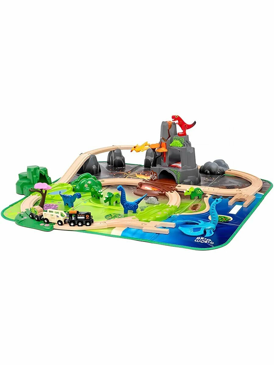 BRIO 36104 – Роскошный набор «Мир Динозавров» Deluxe – это уникальный игровой набор, который позволит вашему ребенку погрузиться в доисторический мир динозавров. В комплекте вы найдете 45 предметов, включая фигурки динозавров, множество игровых поездов и извергающийся вулкан со световыми, звуковыми и паровыми эффектами.