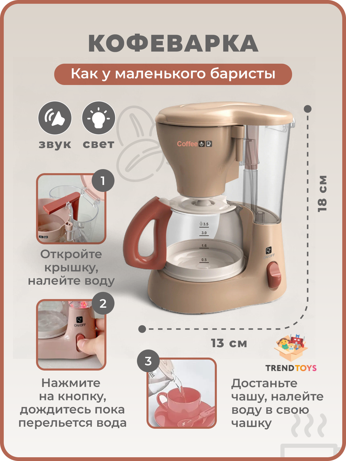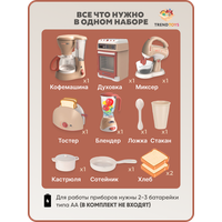 Игровой набор детской бытовой техники идеально подойдет для увлекательных игр. Игрушечные предметы имеют реалистичные функции, например, миксер с вращающимся венчиком, тостер с таймером и всплывающим тостом, блендер с функцией вращения. А также кофеварка со звуковыми эффектами, духовка и плита в одном, можно открыть дверцу и приготовить всеми любимую пиццу.