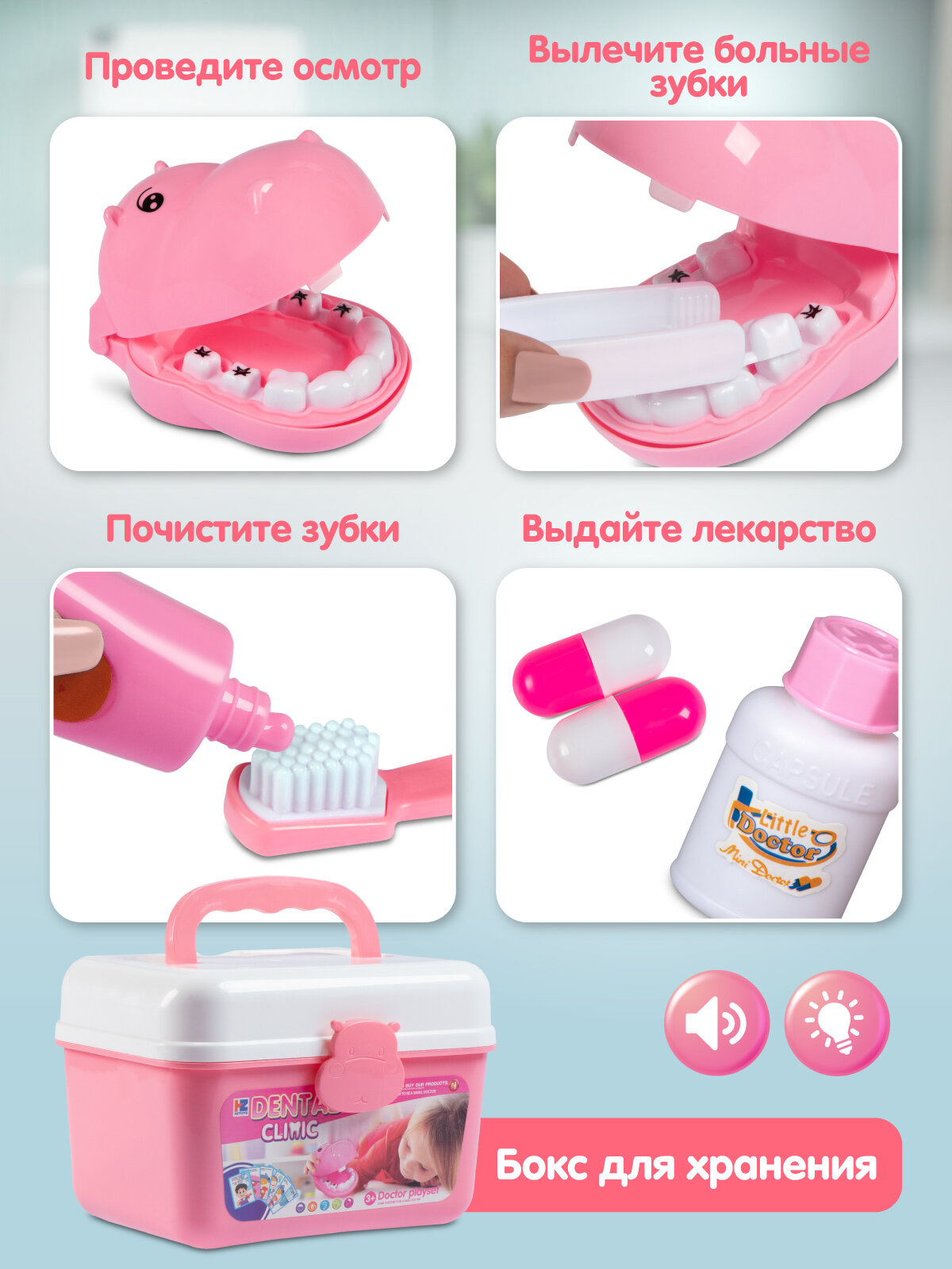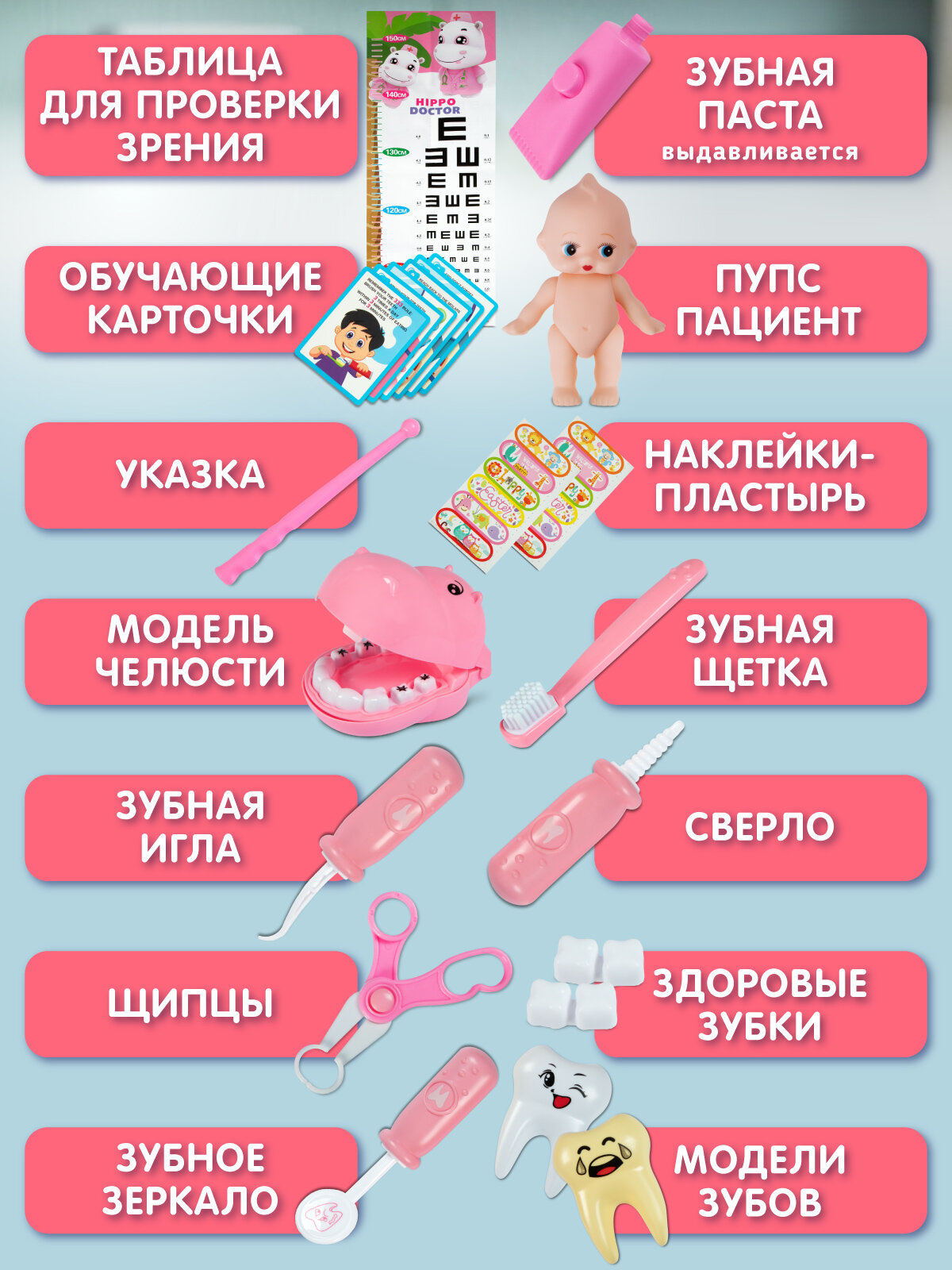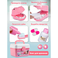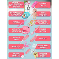 Игровой набор "Доктор" — великолепный подарок для мальчиков и девочек. С его помощью ребёнок почувствует себя настоящим доктором, проведет осмотр и вылечит пациентов или устроит вместе с друзьями настоящий медицинский кабинет. В наборе есть все необходимое для увлекательной игры: пупс -пациент, модель челюсти со съемными зубками, стоматологическое зеркало, индикатор кариеса, сверло, зубная игла, лоток, пинцет, зубная щетка, зубная паста, модель зубов, шприц, баночка, пластыри, капельница, ложечки, очки, таблица для проверки зрения, стетоскоп, градусник, скальпель, таблетки, грелка, щипцы, обучающие карточки, бейджик доктора, указка.