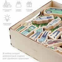 Разыграйте воображение вашего ребенка с деревянным игровым набором Город. Мчать с мигалками за опасным нарушителем, лечить людей, делая их здоровыми и счастливыми, а в конце дня собраться дома всей семьей, делясь тем, как прошел день. Воплотить фантазии в реальность поможет игра Город. Все изображения на фигурках максимально приближены к реальности. Игра содержит 6 самостоятельных мини-наборов, которыми можно дополнять друг друга, создавая целую сюжетную линию приключений. Ребенок может стать даже мэром города и придумать ему свое название. Развивающие игрушки для детей способствуют повышению навыков мелкой моторики; прокачки воображения и усидчивости; помогают сформировать навыки социализации и коммуникации; умение воплощать свои идеи в жизнь; пробовать и изучать новые профессии. Комплект включает в себя: 6 зданий (банк, госпиталь, школа, полицейский участок, 2 жилых дома); 12 подставок для зданий; двухсторонние фигурки людей 15 шт; 2 фигурки предметов и 1 фигурка дерева (двусторонние), 2 фигурки животных (двухсторонние); 4 фигурки транспортных средств (двухстороннние); деревянный поднос. Вес 2 кг. Подходит для сюжетно-ролевых игр. Будет интересен и мальчикам, и девочкам от двух лет. Детали набора выполнены из дерева. Хорошо отшлифованы, экологичны и приятны на ощупь. Рисунок нанесен с помощью высококачественной УФ-печати по дереву. Правила ухода: Деревянные игрушки не рекомендуем мыть водой с мылом. Дерево – чувствительный к влаге материал. При необходимости элементы набора протрите чуть влажной тканью. Упаковка – картонная коробка, которая также может стать подарочной. Деревянная развивайка - это отличный подарок детям на день рождения; новогодние праздники под елку; любое другое событие или просто порадовать. Основной набор можно дополнить другими мини-наборами из коллекции, расширяя игру и делая ее более увлекательной.