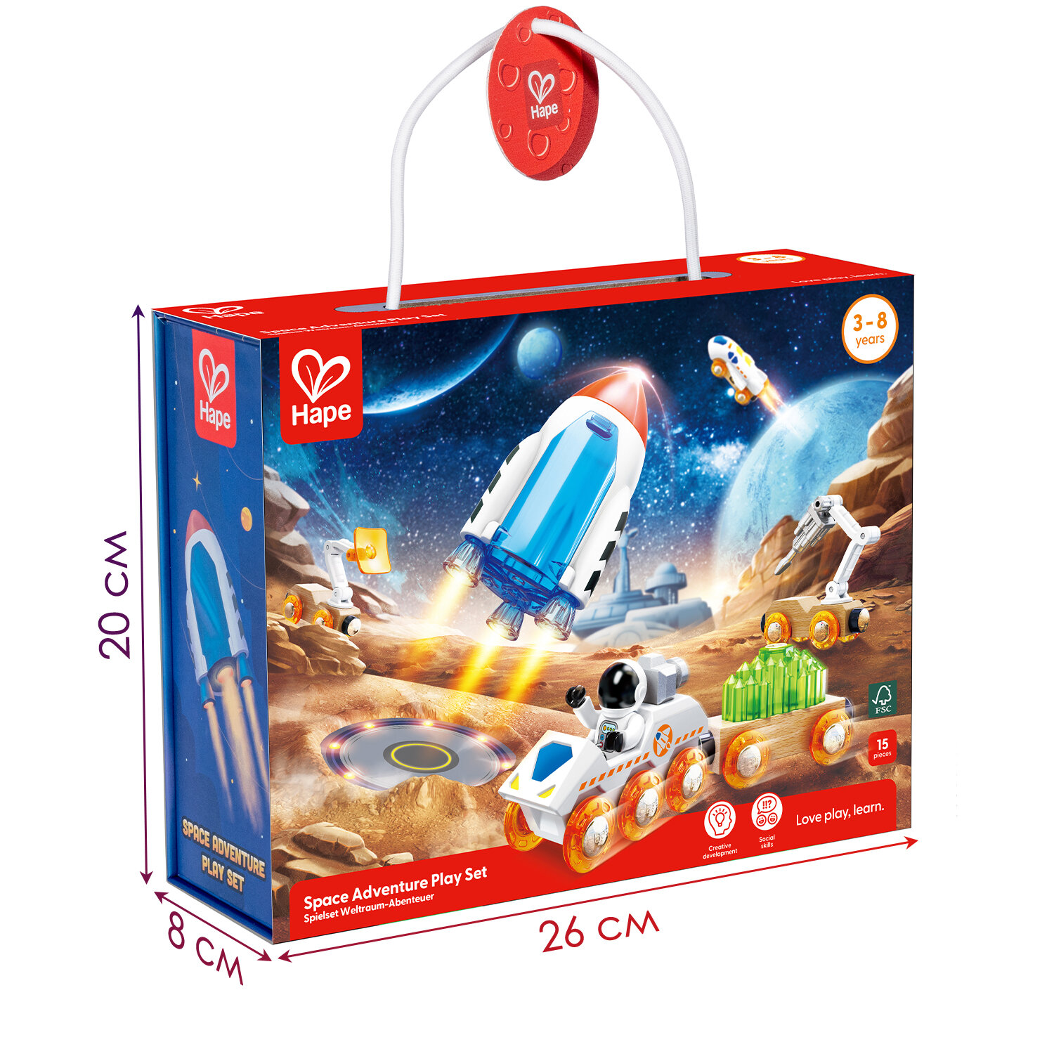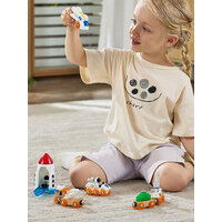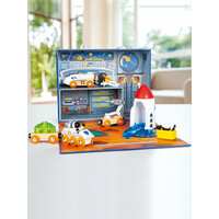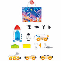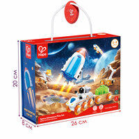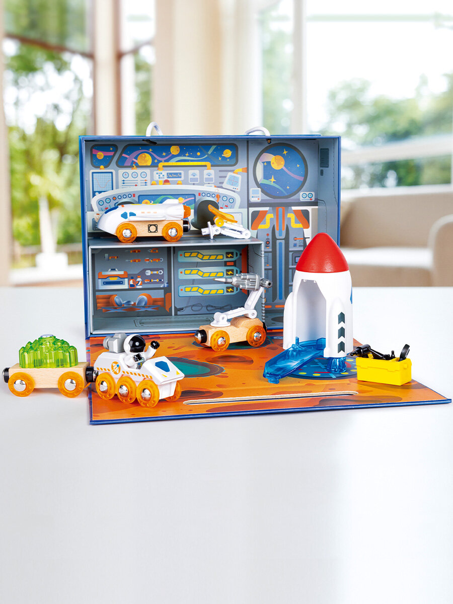 Комплектация: 1 самолет, 1 ракета, 1 исследовательская машина, 2 прицепа, 1 радар, 1 дрель, 1 груз, 1 фигурка космонавта, 4 инструмента, 1 ящик для инструментов. Материалы: дерево (бук), пластик (ABS), нержавеющая сталь. Габариты игрушки (ДхШхВ): 26 х 8 х 20 см. Возрастные рекомендации: подарочный набор подходит для мальчиков и девочек от 3 лет.