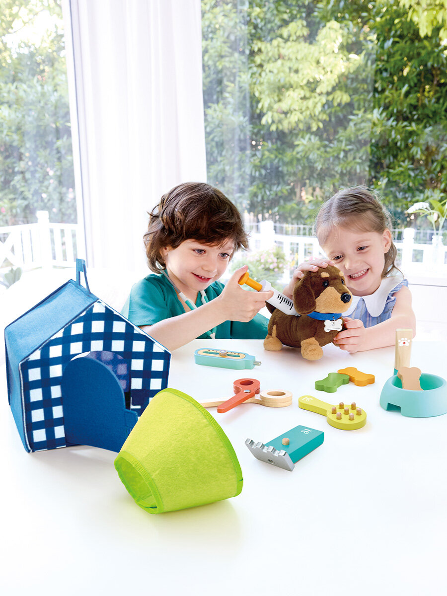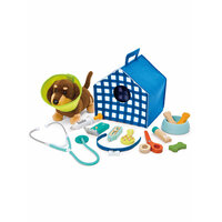 Набор включает в себя обширный ассортимент медицинских принадлежностей: стетоскоп, шприц, ножницы и другие необходимые для ухода за животным вещи. Также к комплекту прилагается симпатичная будка для щенка с удобной ручкой, которую можно использовать как для транспортировки, так и для хранения всех аксессуаров.